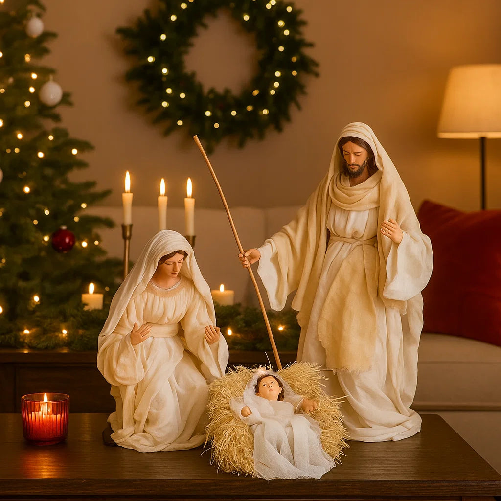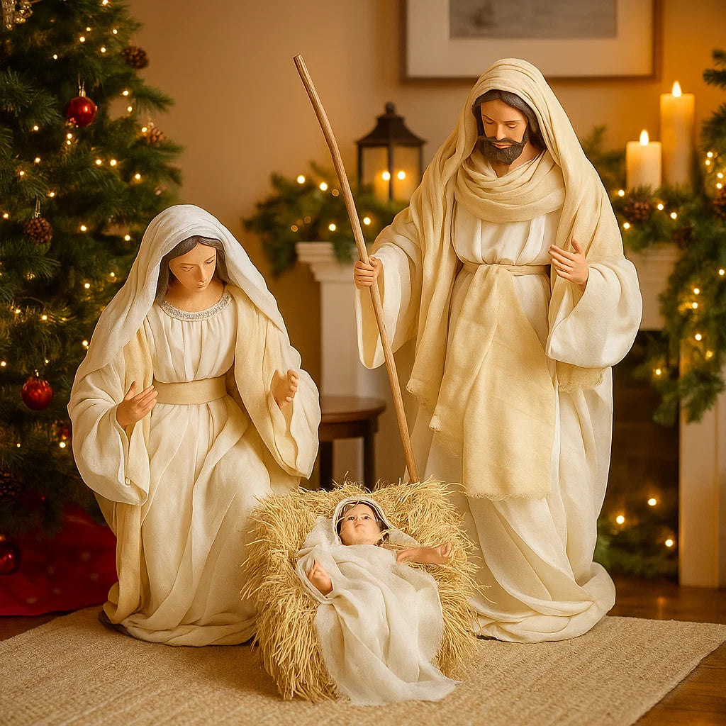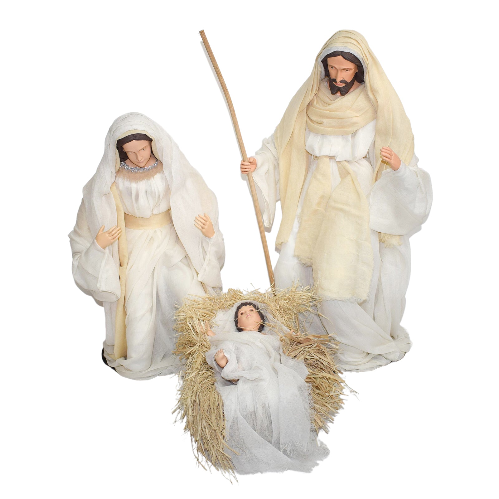 Natività con vestiti in tessuto Beige e Bianco statue per presepe h 73 cm