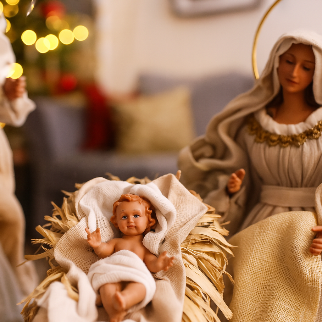 Composta da tre personaggi principali, realizzati interamente in resina di alta qualità, offre dettagli realistici nei volti e nelle pieghe delle vesti, trasmettendo calore e spiritualità.
