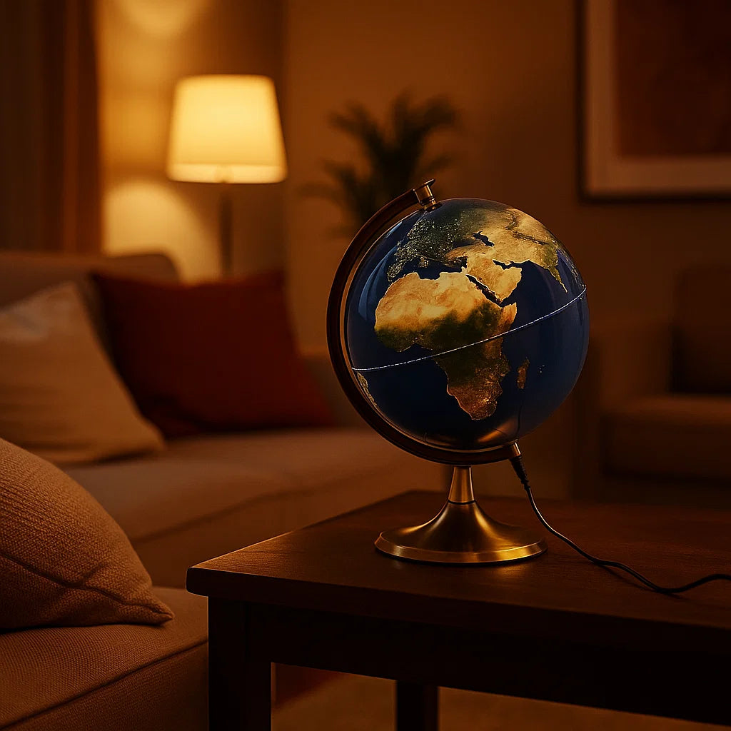 L'illuminazione interna a LED svolge un ruolo cruciale in questo oggetto decorativo, poiché non solo esalta i dettagli del mappamondo quando è acceso, creando un effetto visivo suggestivo e coinvolgente, ma garantisce anche un consumo energetico efficiente e una lunga durata, rendendolo un'opzione sostenibile e pratica per l'illuminazione d'ambiente.