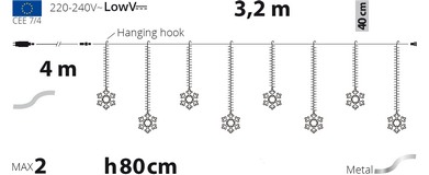 Da un cavo argento lungo 3,2 metri pendono 8 cristalli di neve a diverse altezze (alternativamente 70 e 80 centimetri).