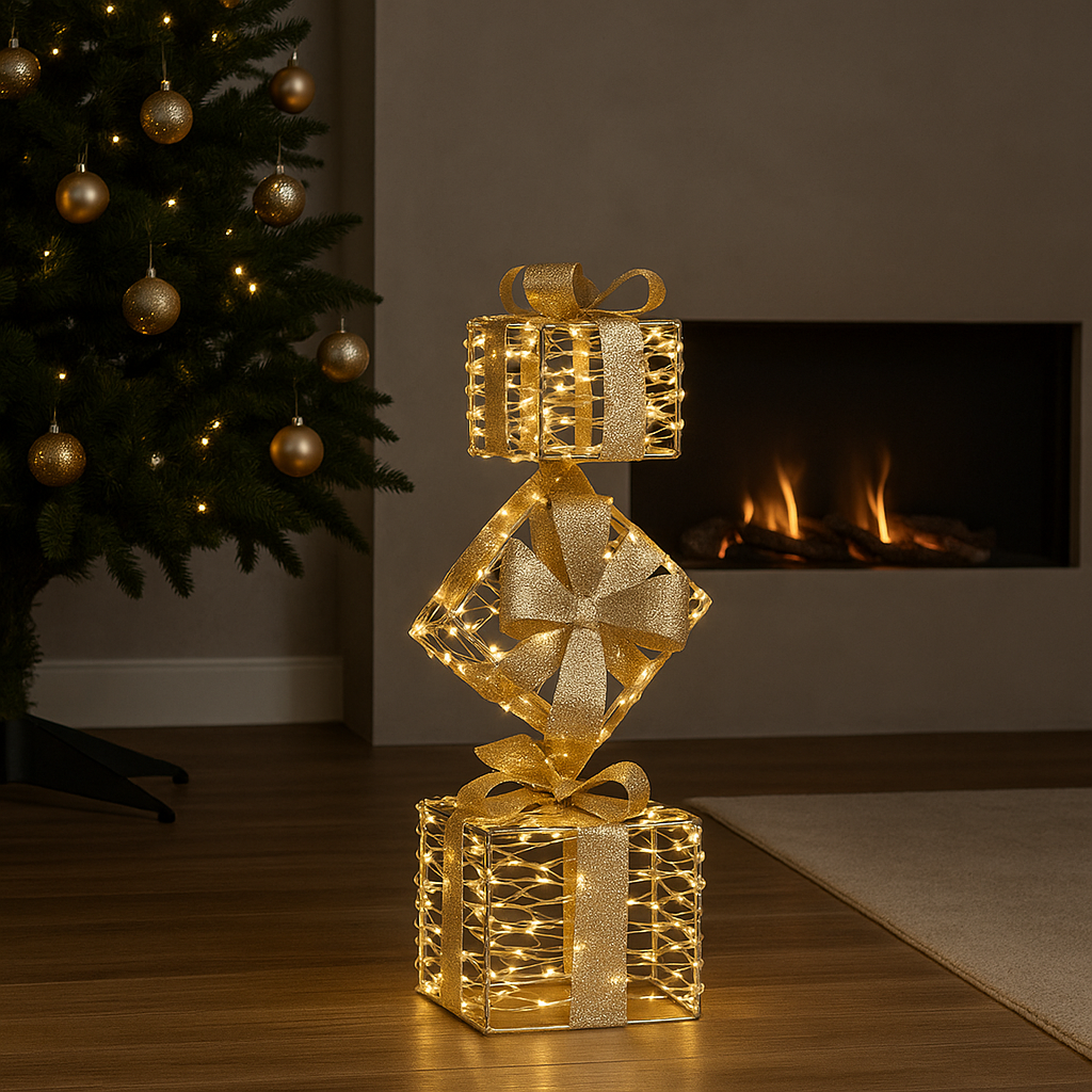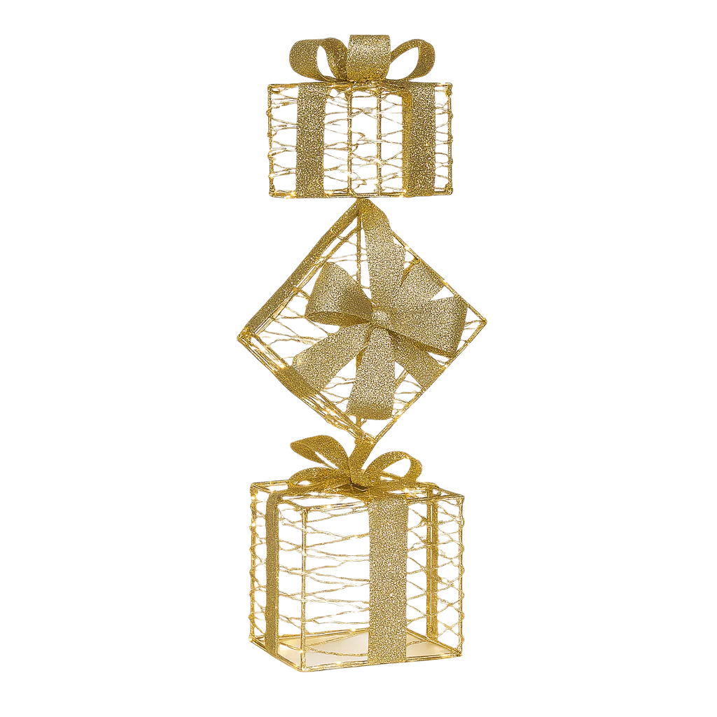 Questa composizione decorativa raffigura un insieme di pacchi regalo natalizi realizzati interamente in metallo, un materiale che conferisce solidità alla struttura e una finitura luminosa capace di catturare la luce in modo elegante.