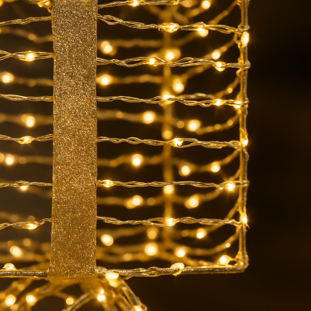 All’interno della composizione è integrato un sistema di luci a batteria, composto da piccoli punti luminosi che si diffondono attraverso i trafori o tra gli spazi dei pacchi, proiettando delicati bagliori e ombre che amplificano l’effetto scenografico, soprattutto nelle ore serali.