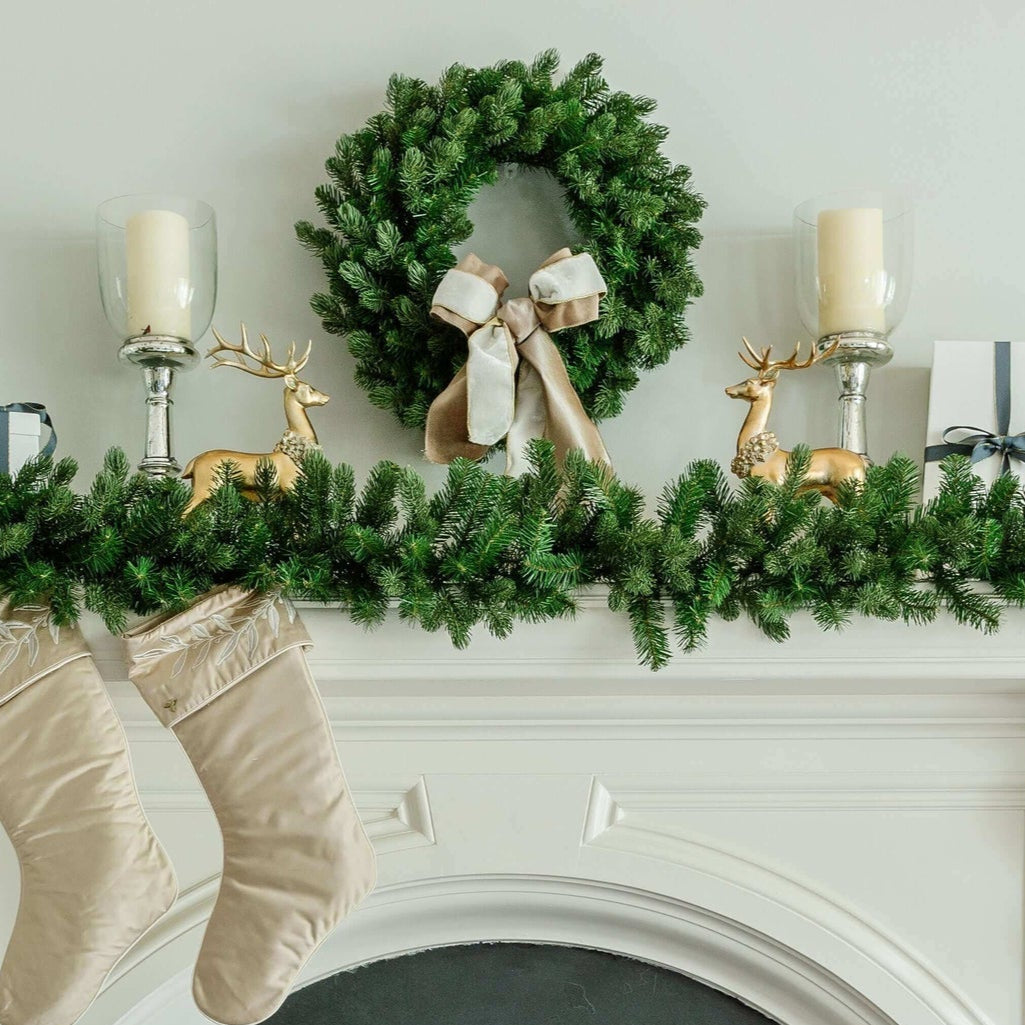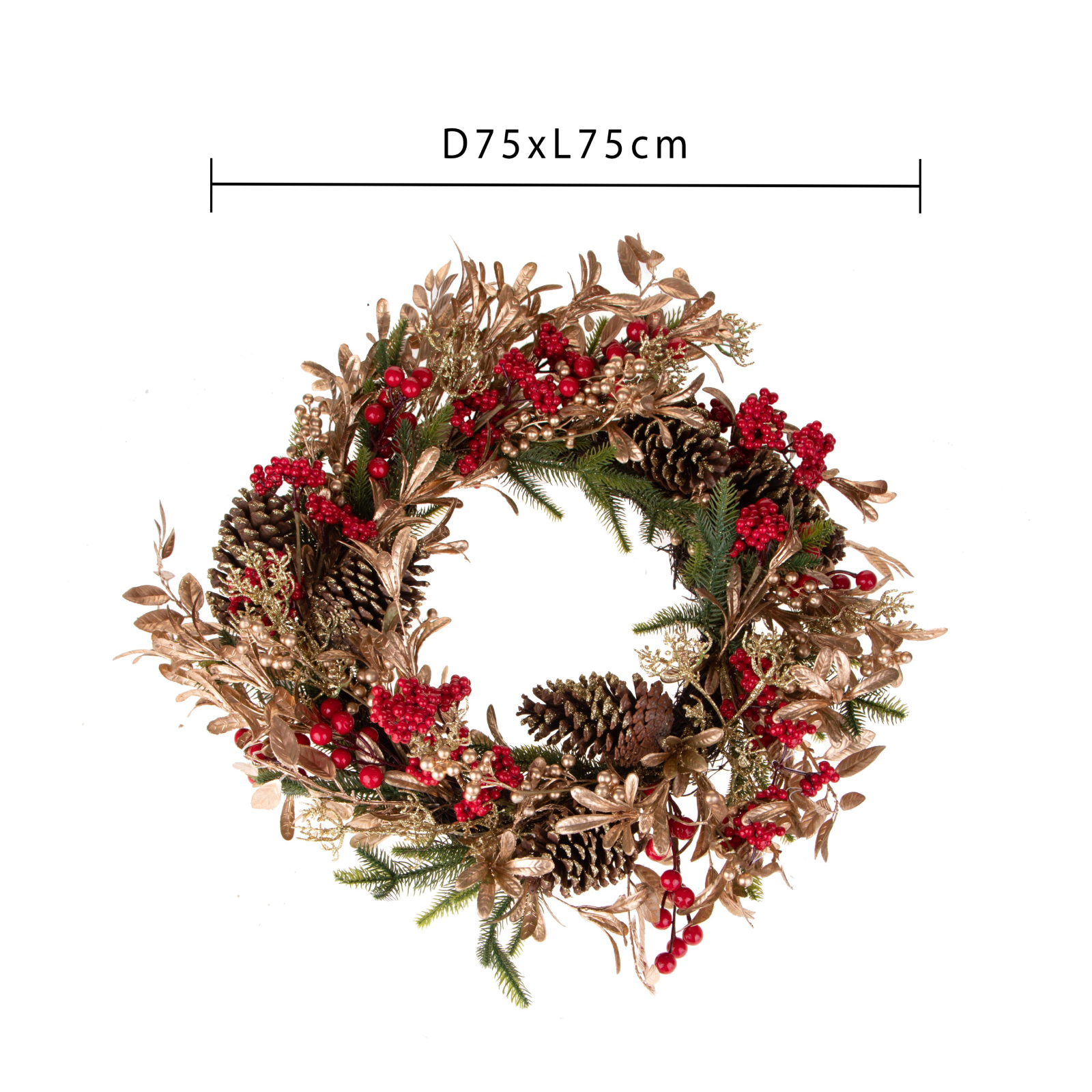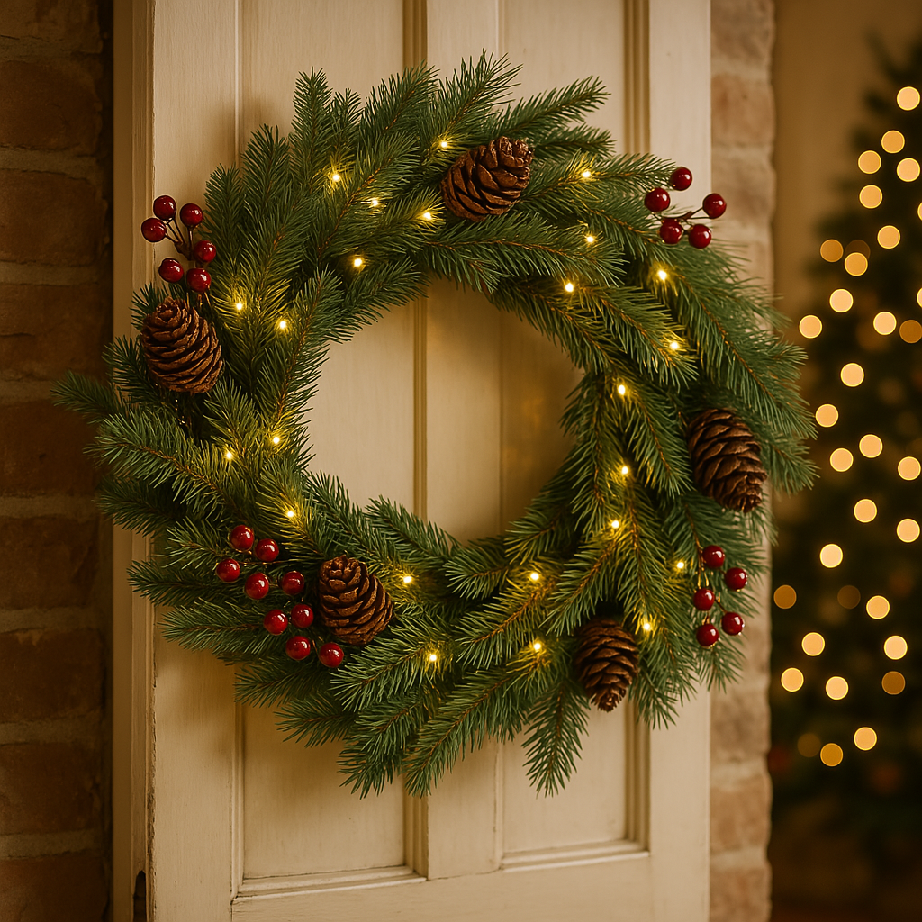 Questa corona unisce la bellezza del metallo dorato alla praticità dell’illuminazione a LED, risultando così una decorazione natalizia versatile e di grande impatto visivo.