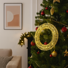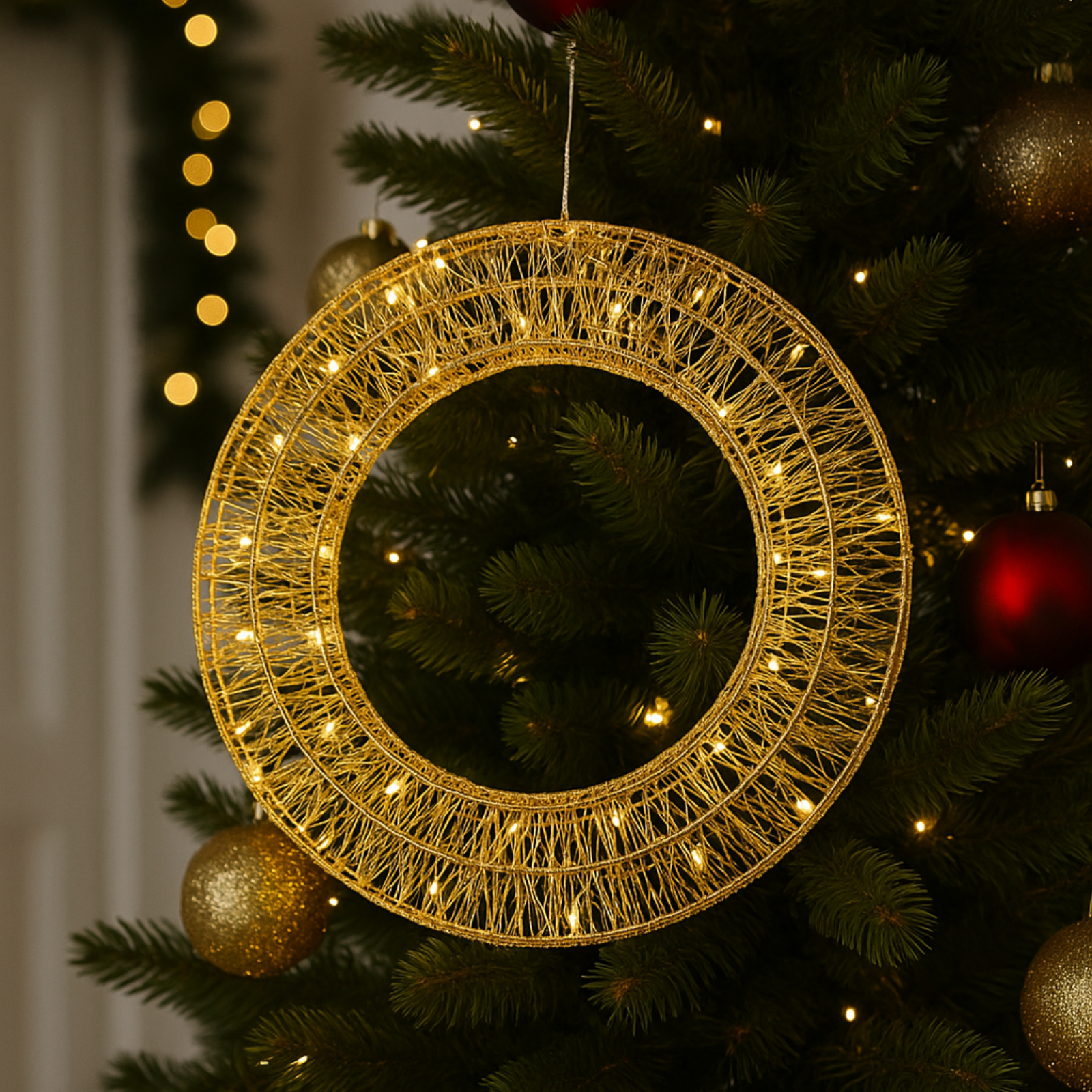 Questa corona natalizia luminosa è un’elegante decorazione realizzata con una struttura circolare in filo metallico intrecciato, di colore oro caldo, che crea un raffinato effetto tridimensionale.