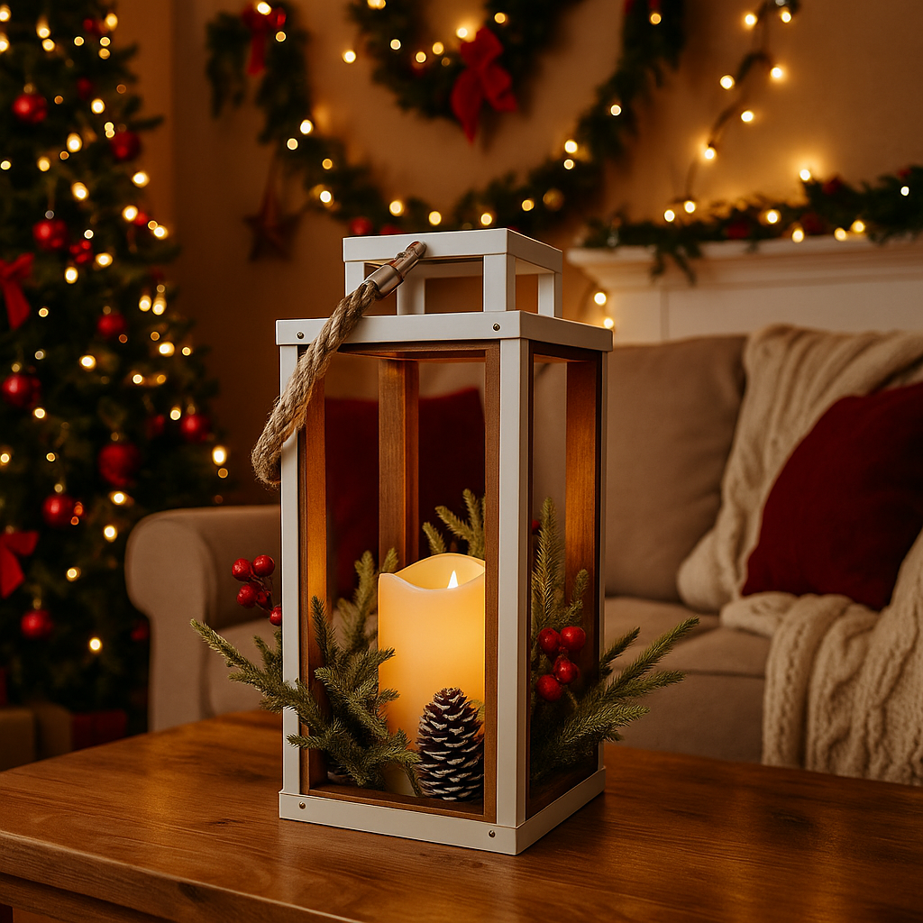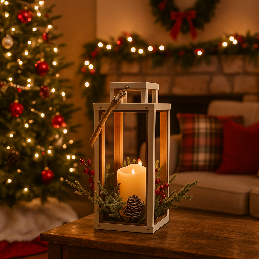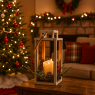 Lanterna in metallo con decorazione rami e bacche, candela con luci a LED