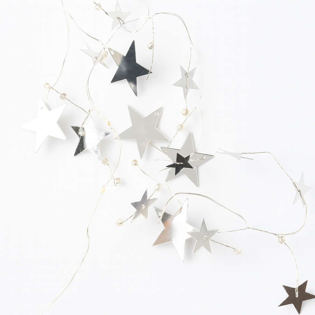 Alla catena luminosa sono appesi decori natalizi in metallo lucido color argento.