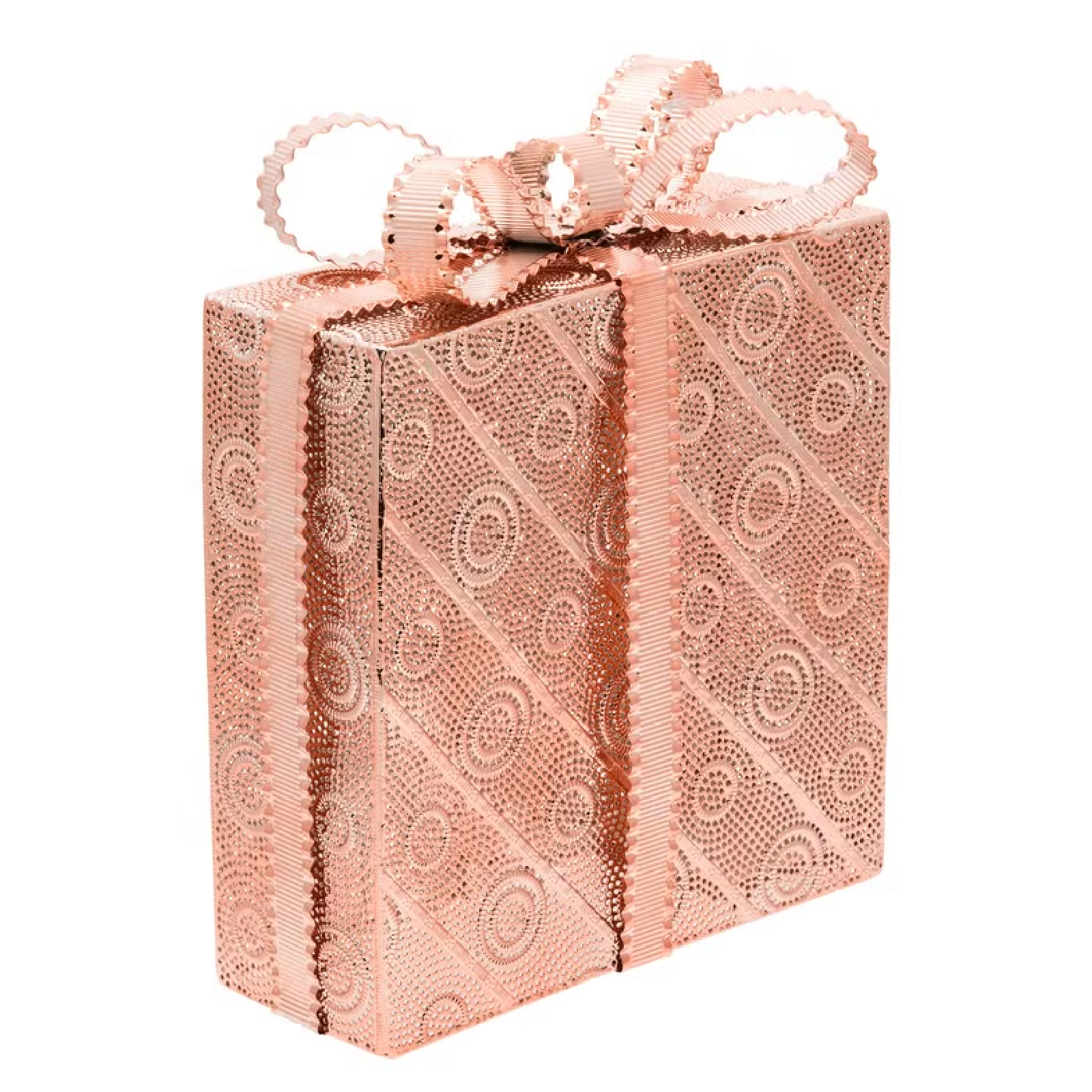 Questo addobbo è in metallo traforato lucido color rame.