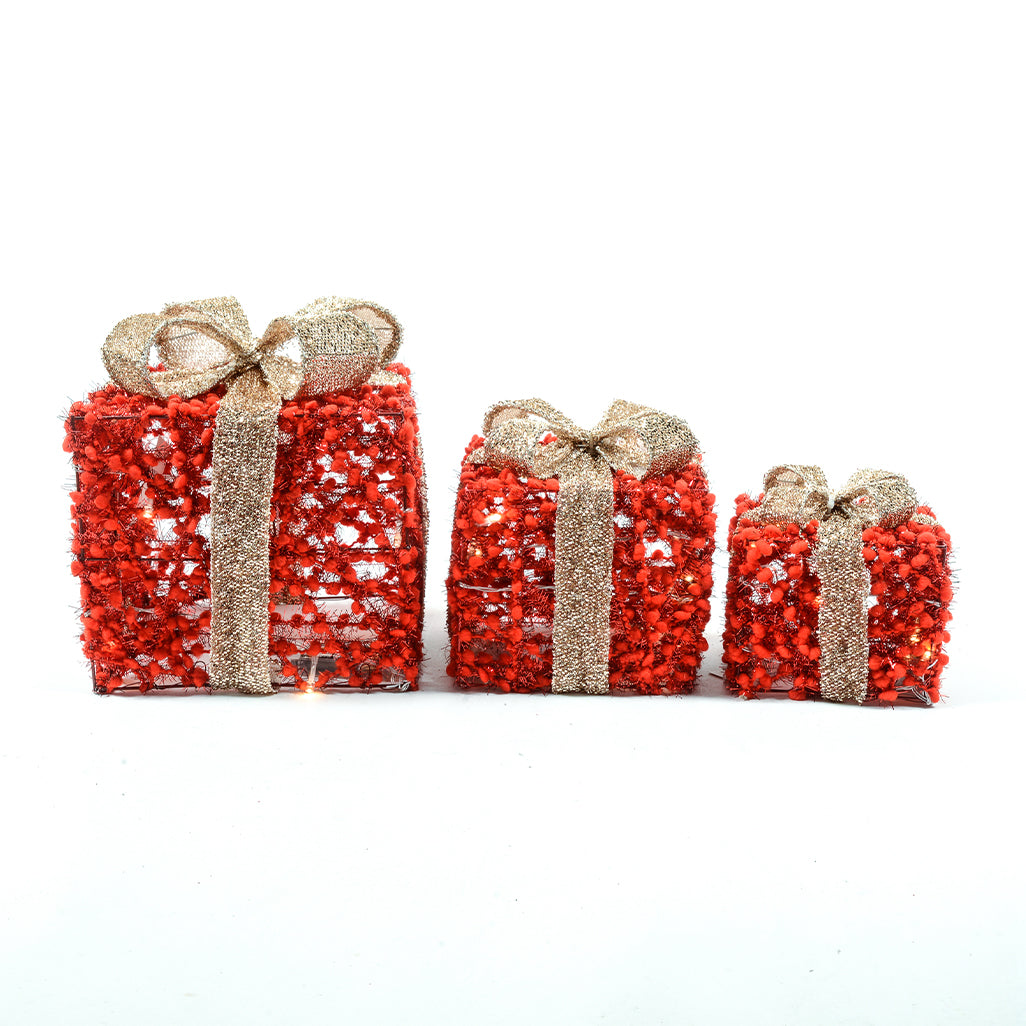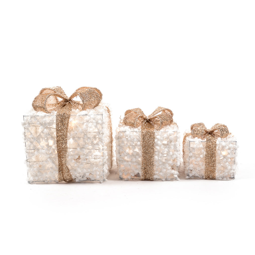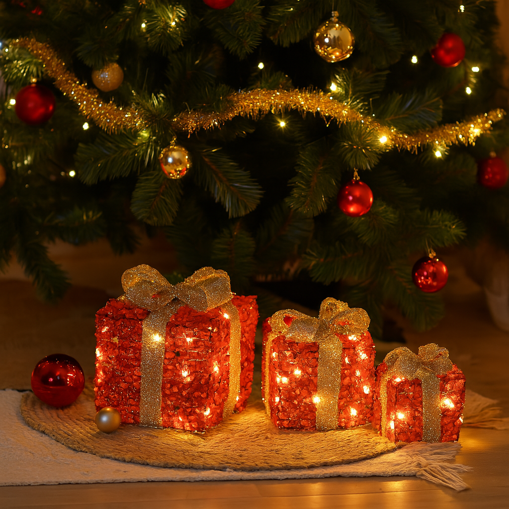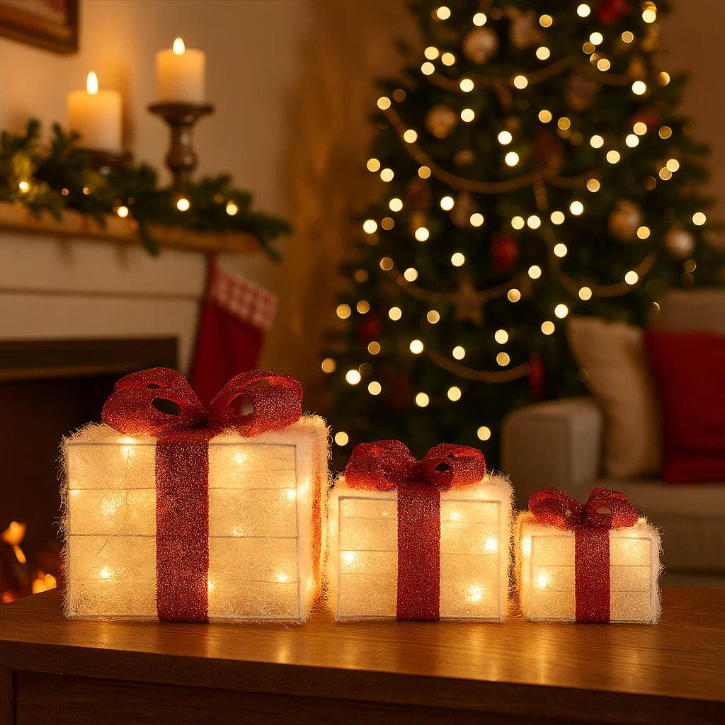 I regali natalizi con luci LED a batteria sono una deliziosa decorazione natalizia composta da un set di tre scatole regalo di diverse dimensioni, illuminate da luci LED alimentate a batteria.
