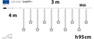 Questa stalattite si compone di 350 MiniLed Ø 3 mm + 580 led SMD neon. La luce emessa dai 350 led fissi bianco caldo e flashing freddo di questa stalattite si diffonde su 3 metri di larghezza. Le calate, distanti 30 centimetri l'una dall'altra, hanno lunghezze diverse (75 e 95 cm).