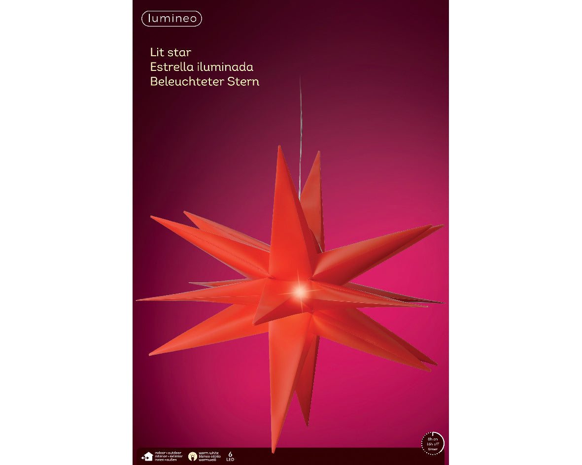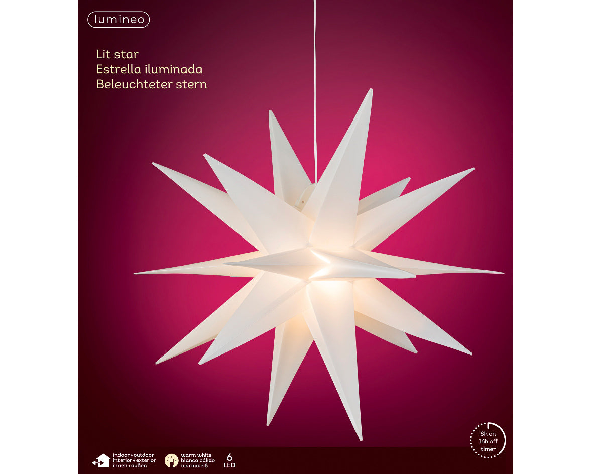 Scopri la stella luminosa 3D con luce bianco caldo e un affascinante gioco di luce automatico flashing nel colore bianco freddo.