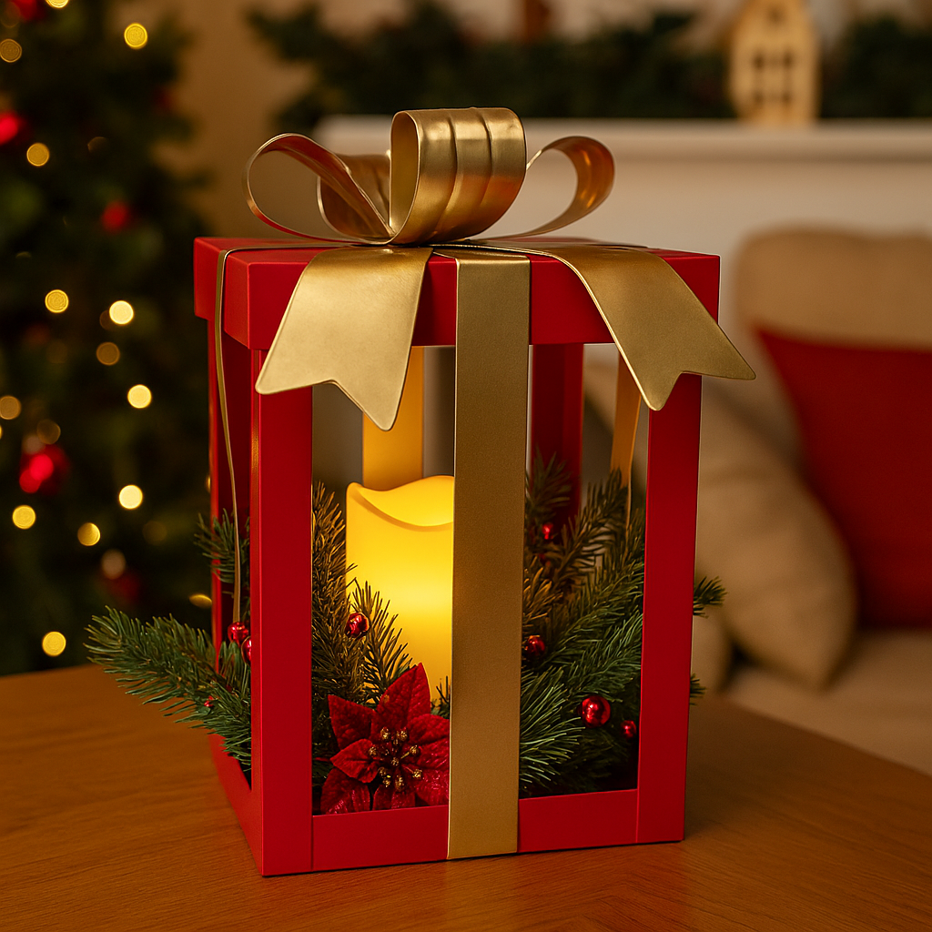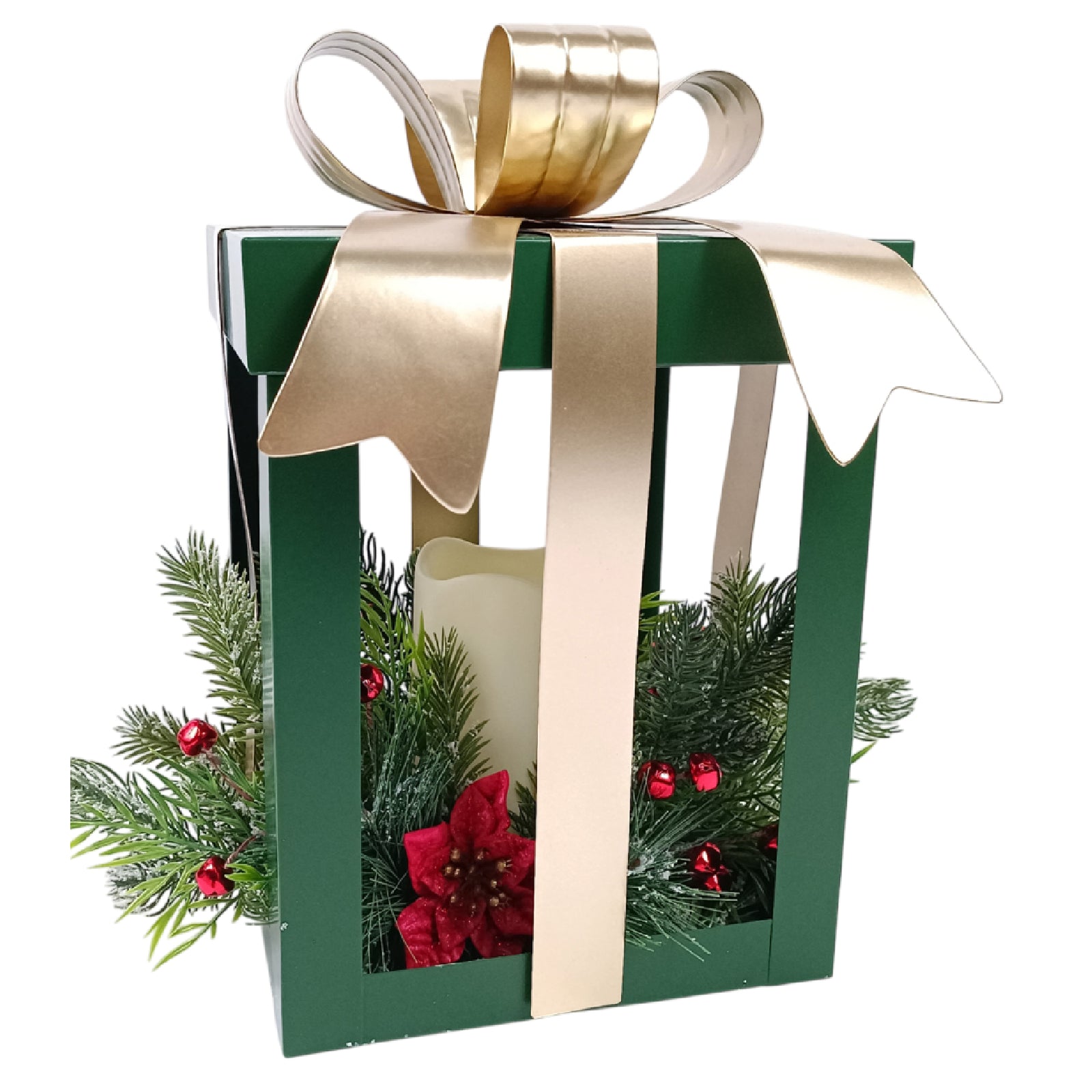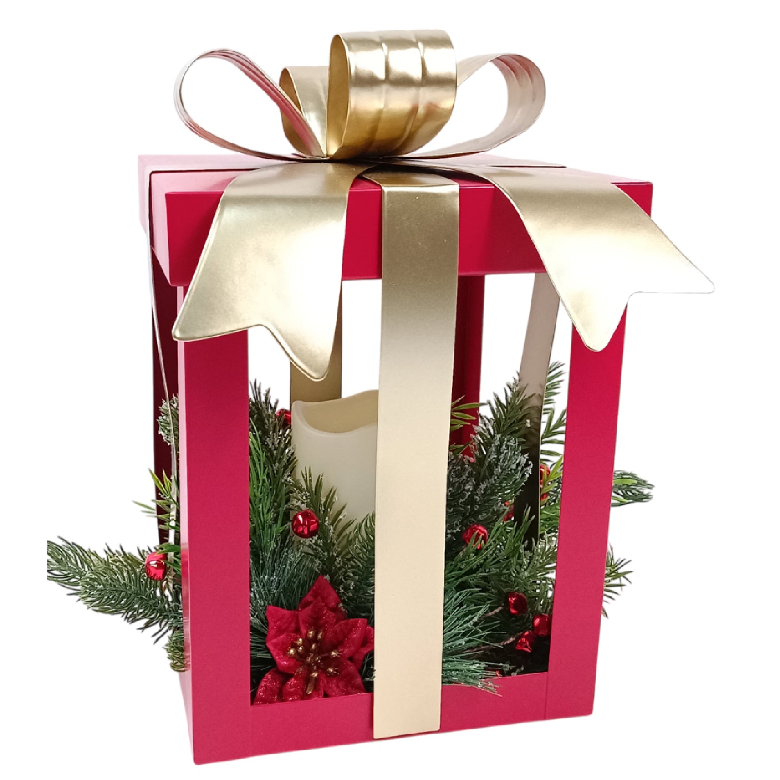 Pacco regalo in metallo con fiocco oro con candela LED decorazione natalizia