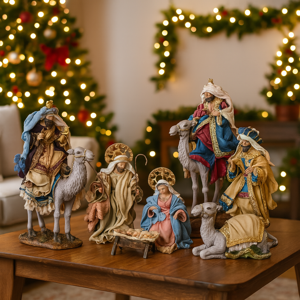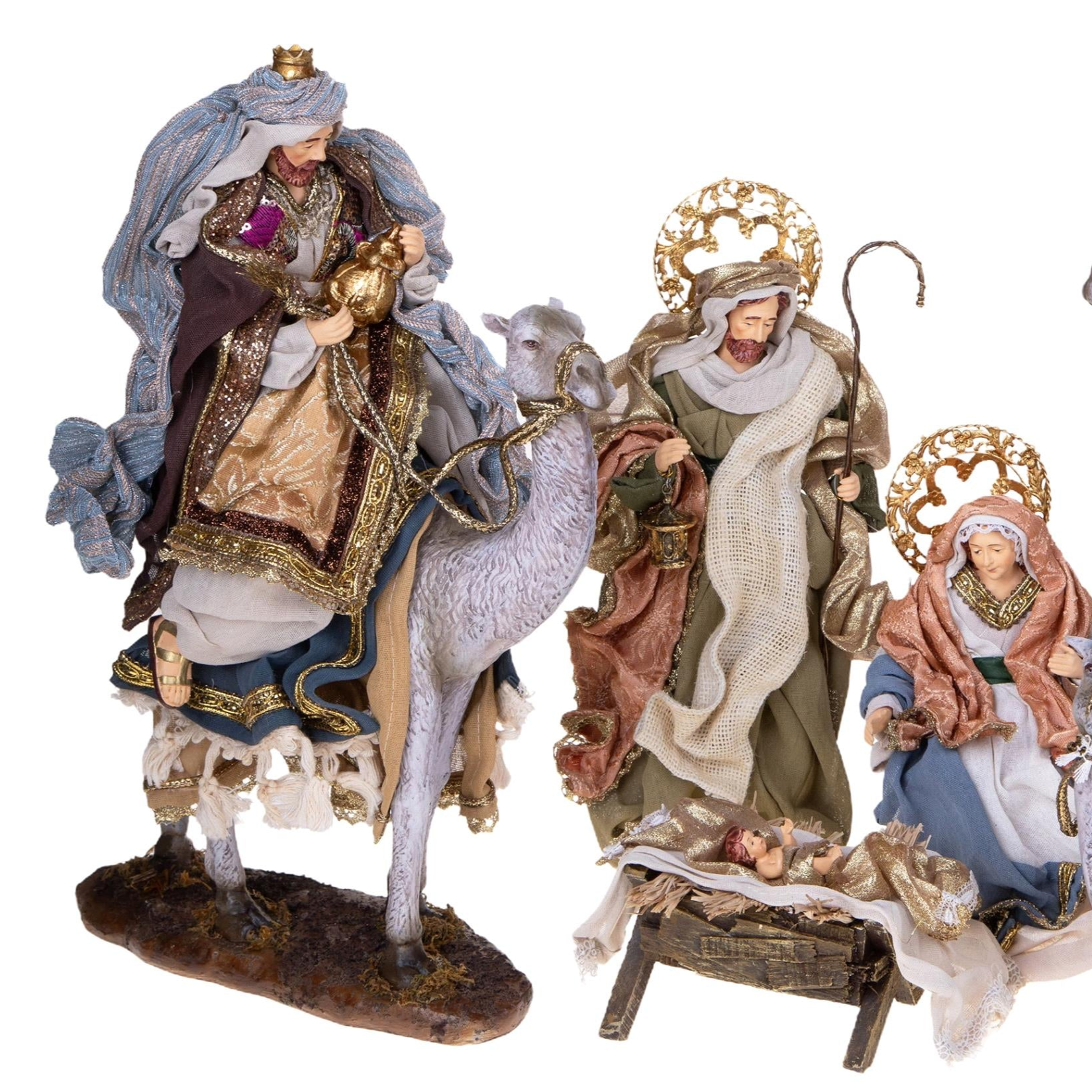 Realizzati con un elegante connubio di tessuto e dettagli accurati, questi personaggi donano un aspetto maestoso e vivace al presepe, perfetto per chi desidera celebrare il Natale con un allestimento scenografico e ricco di significato.
