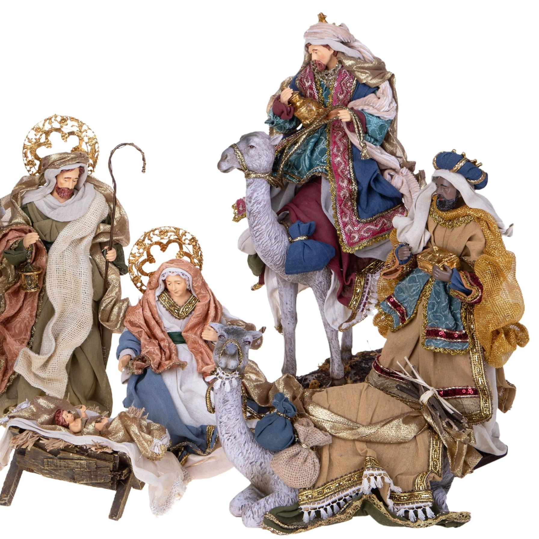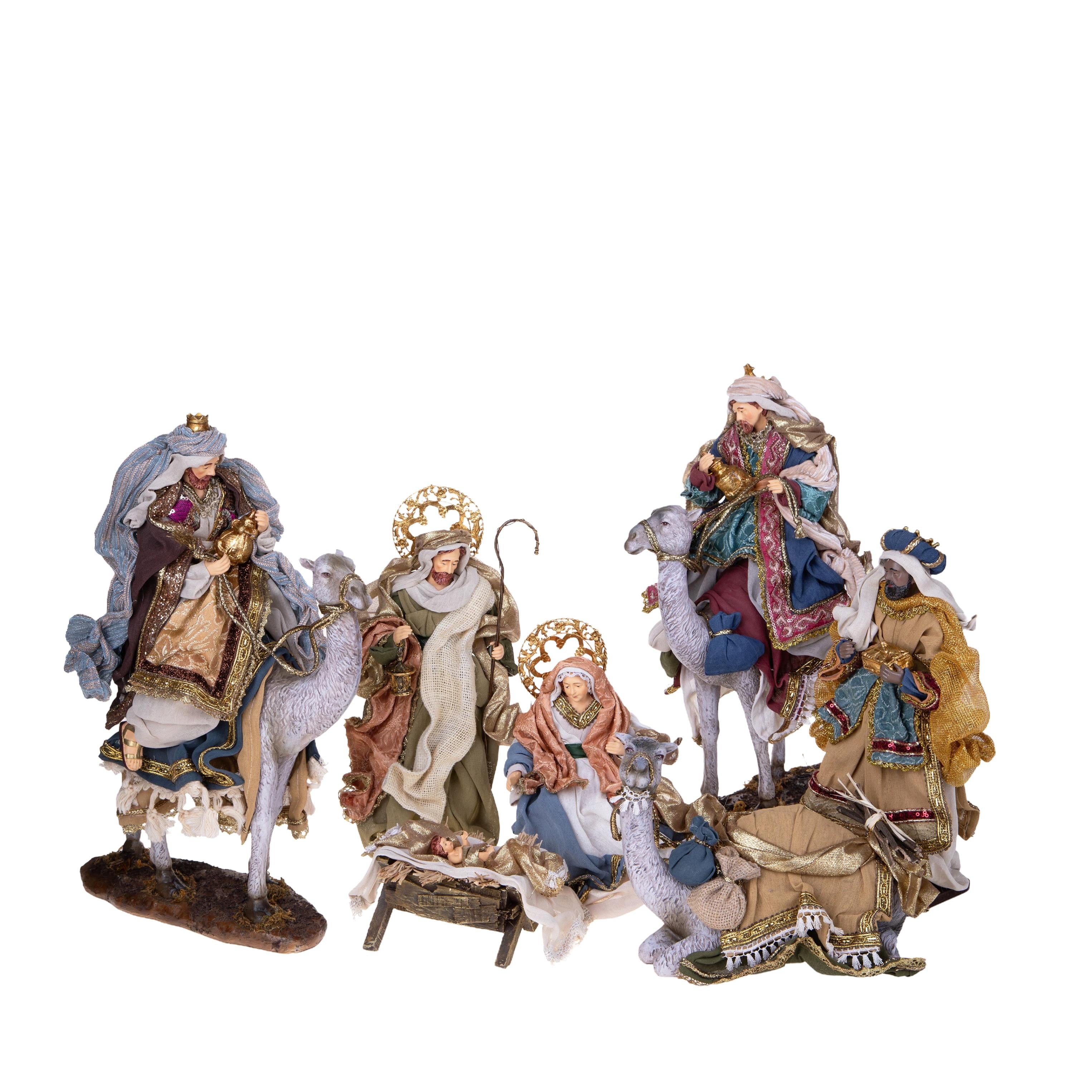 Set composto da 7 personaggi: la Sacra Famiglia, i tre Re Magi e un cammello, tutti decorati con tessuti pregiati e finiture dettagliate