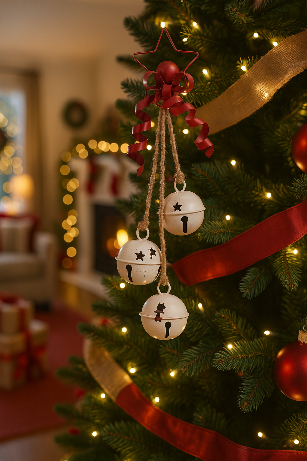 Pendaglio natalizio con stella, nastro decorativo e campanellini
