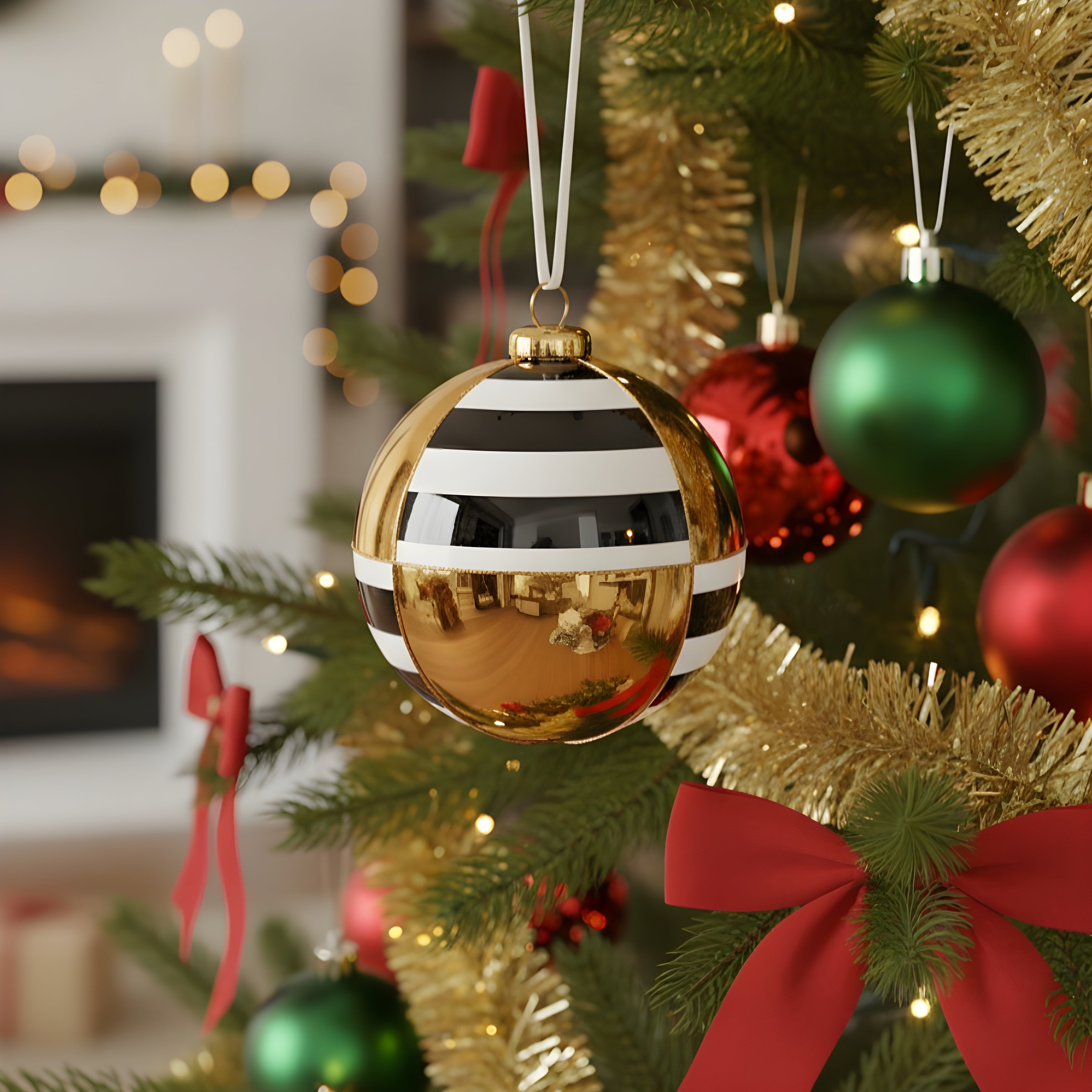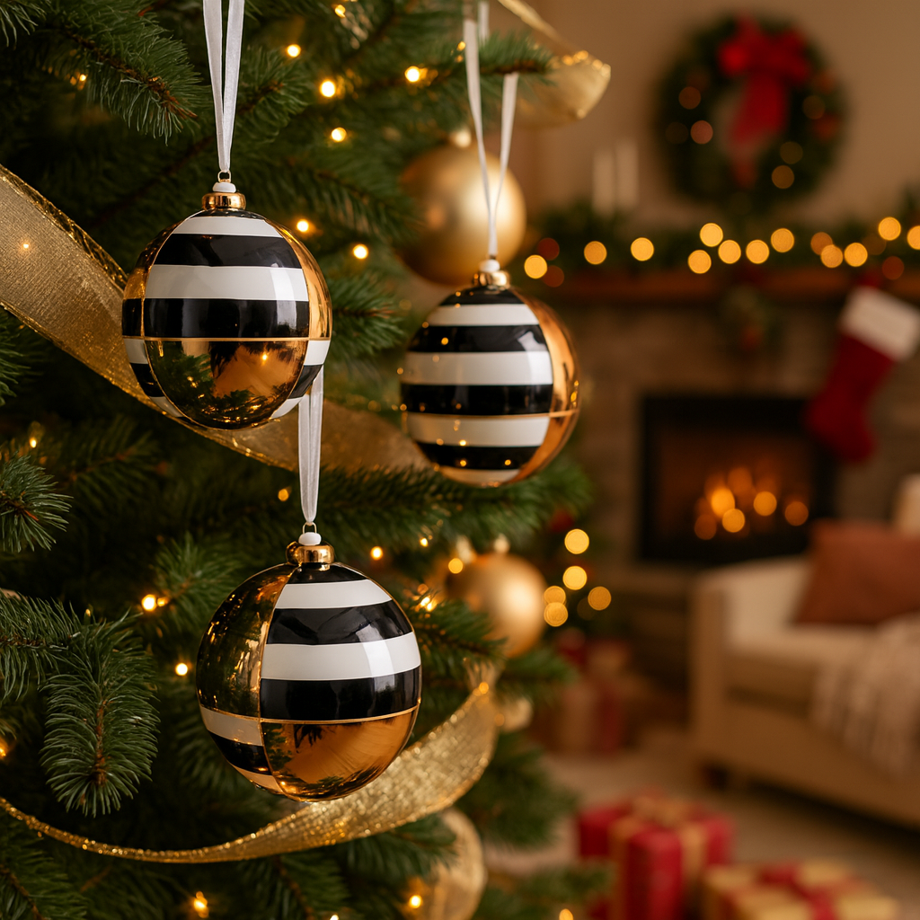 Pallina in vetro colore nero e oro a fasce per albero di Natale