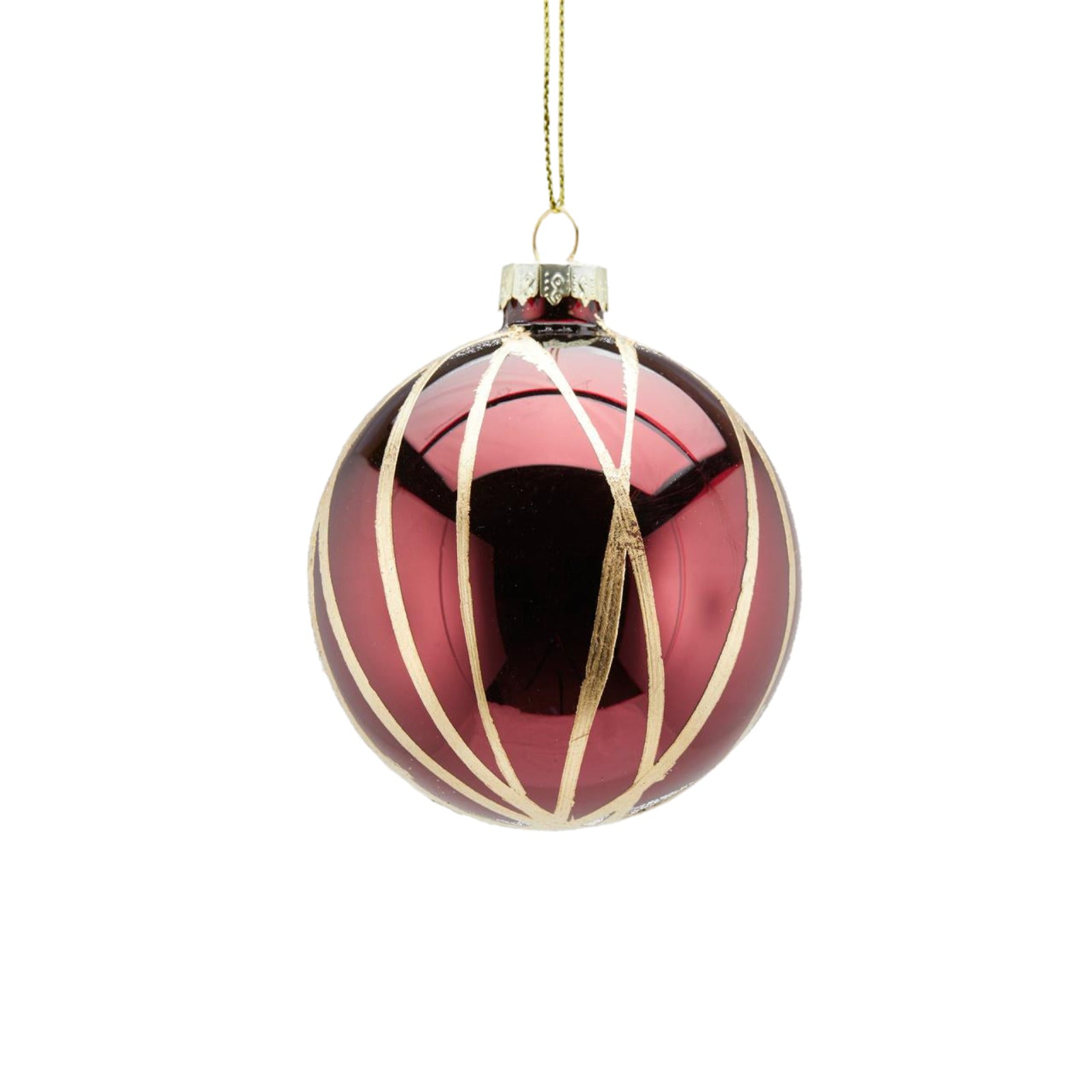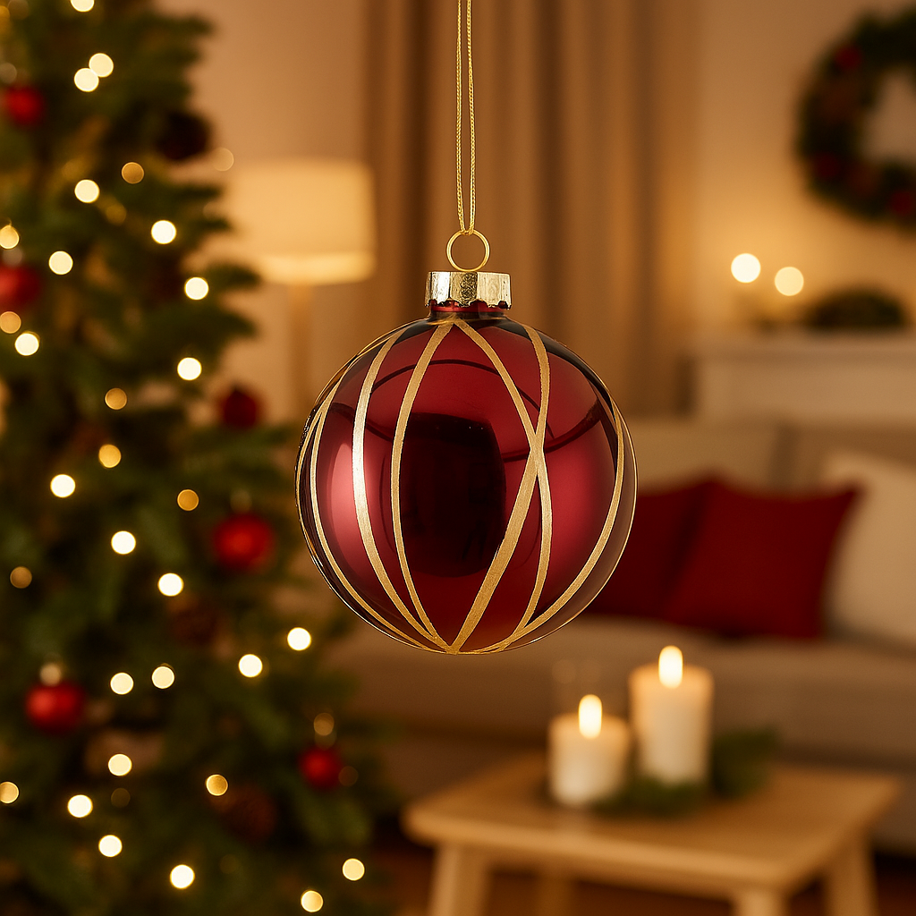 Pallina per albero di Natale in vetro a righe Bordeaux e Oro da 8 cm