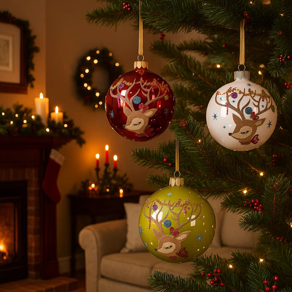 Palline per albero di Natale in vetro decorato con renna da Ø 8 cm, confezione da 12 pezzi
