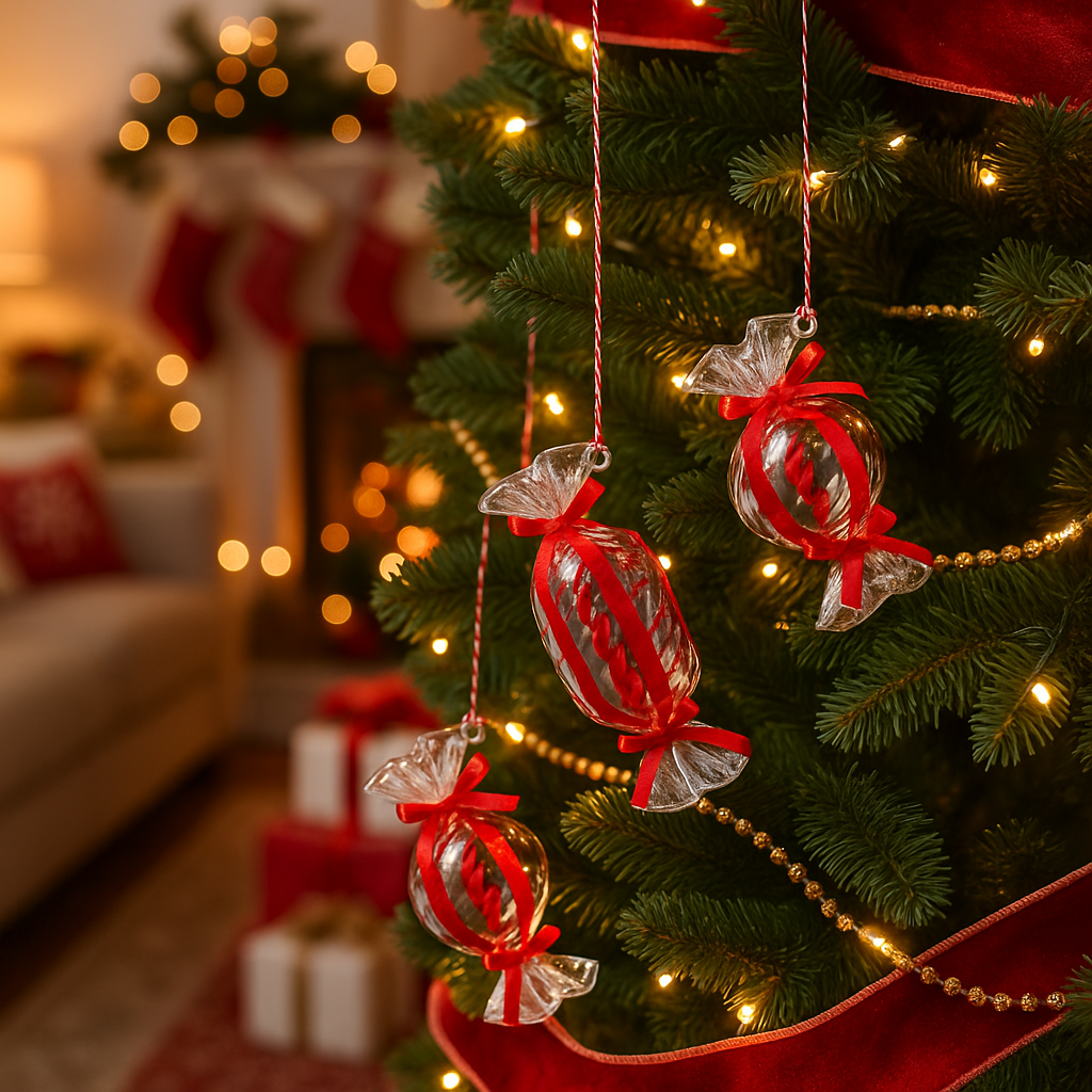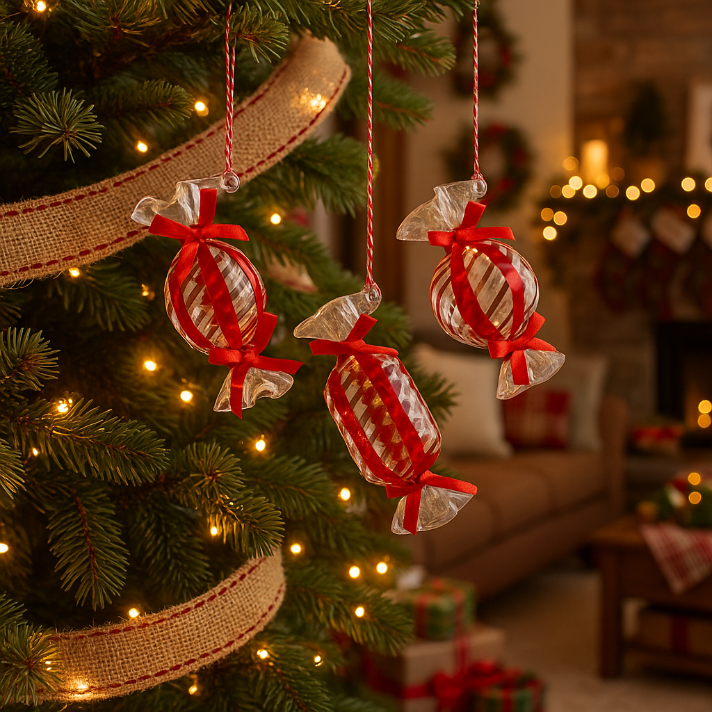 • Set di Pendagli Decorativi in Vetro a forma di caramelle rosse, confezione da 3 pezzi, perfetti per aggiungere dolcezza e allegria al tuo albero di Natale.