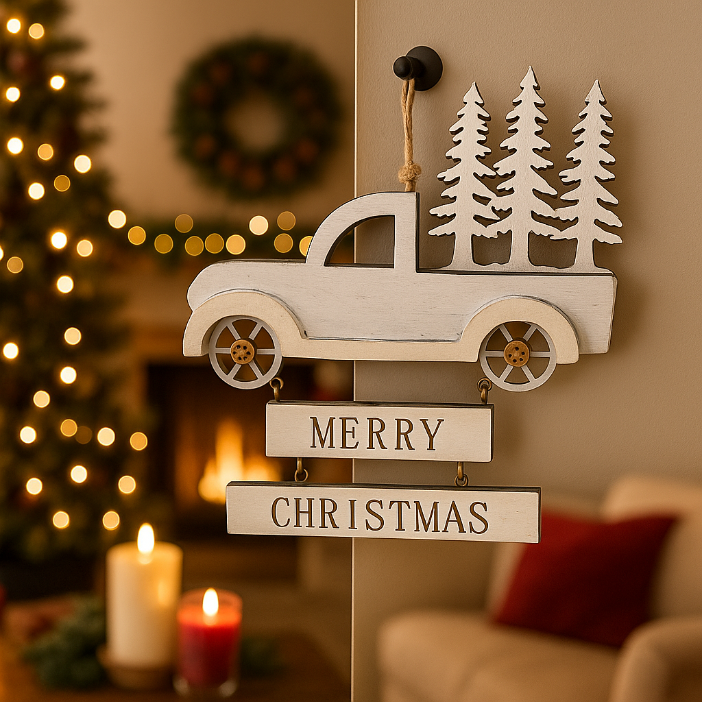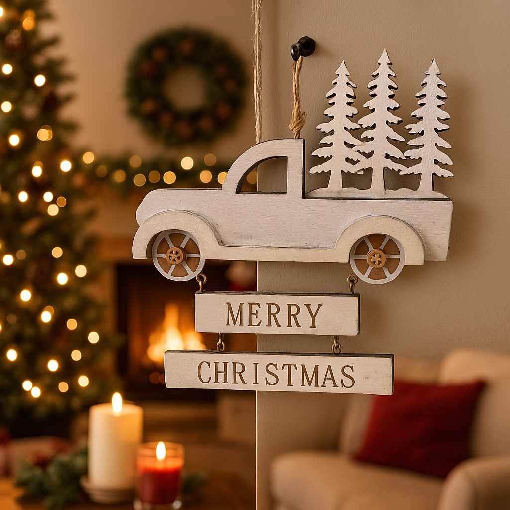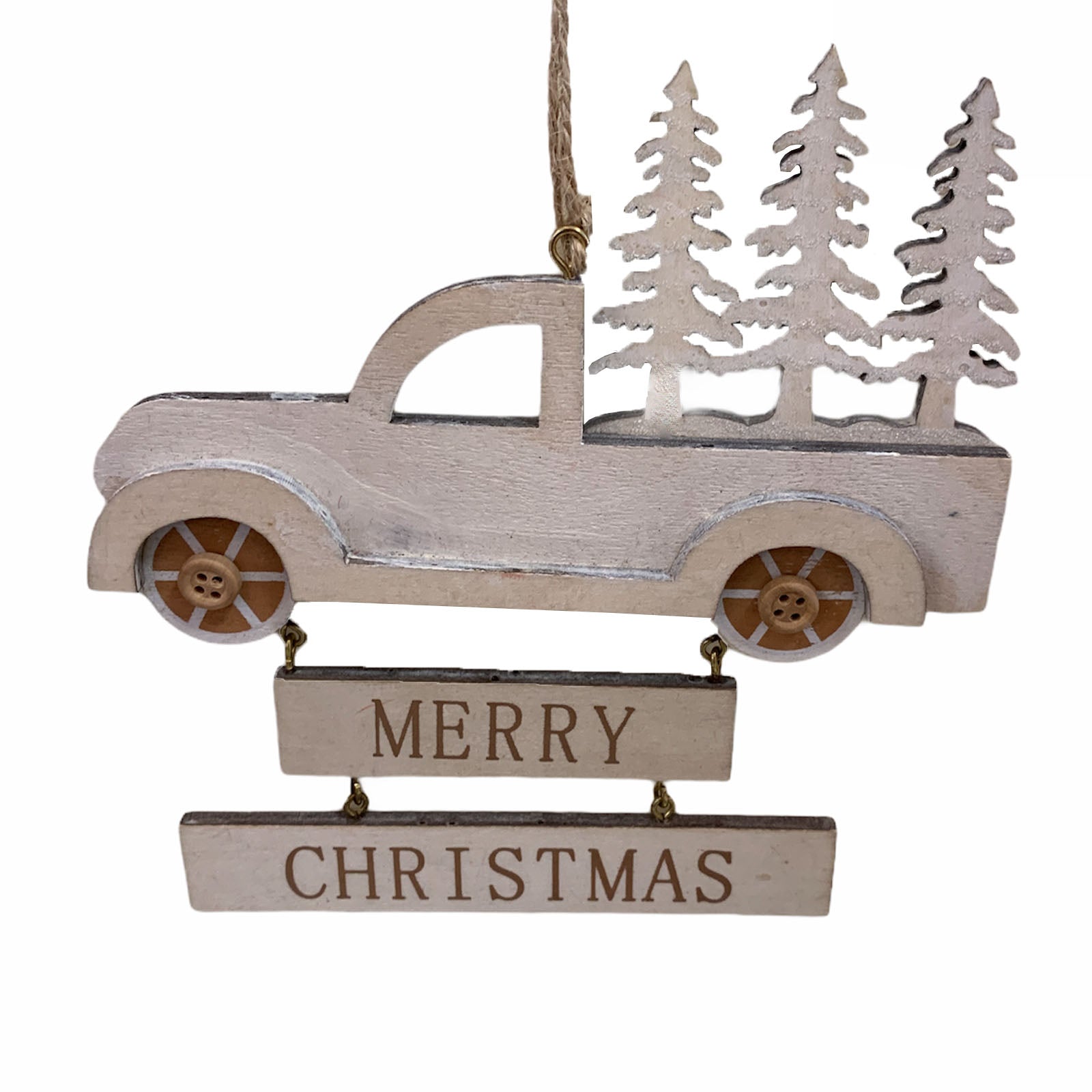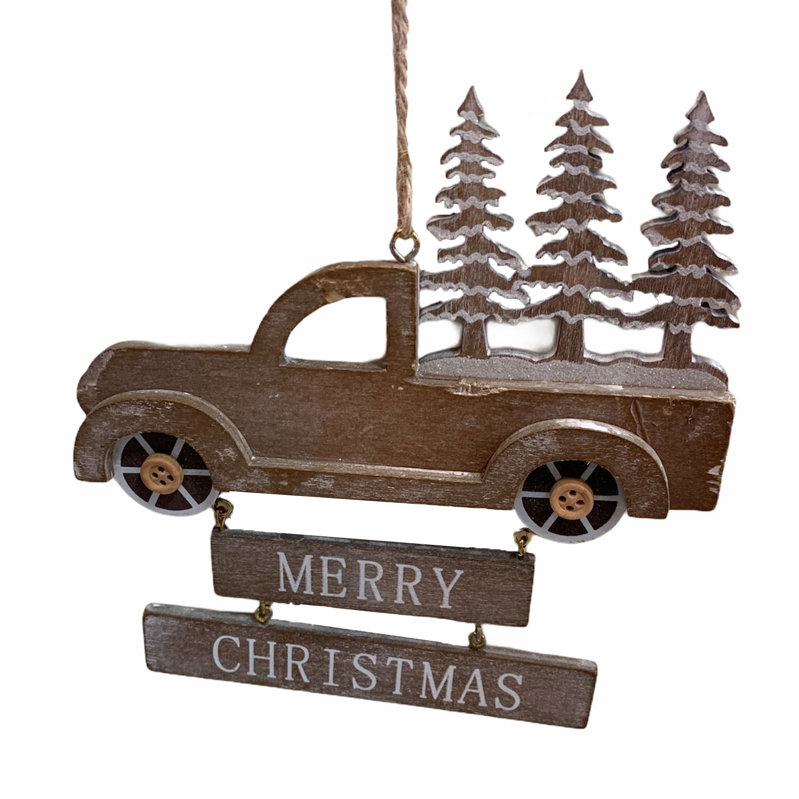 Porta un tocco di originalità e calore al tuo albero con il pendaglio in legno a forma di camion Merry X-Mas.