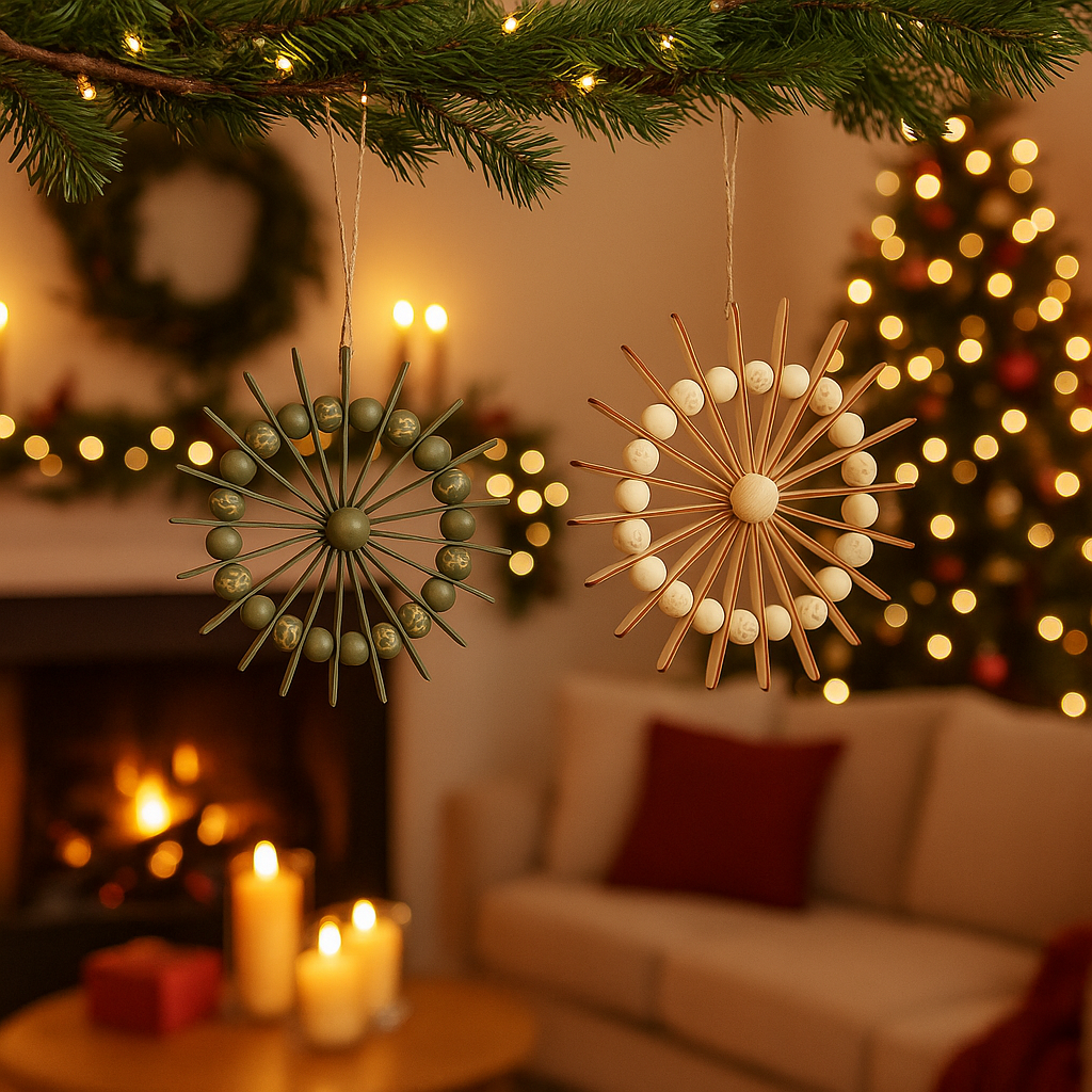 Questa decorazione natalizia in legno con perline decorate è perfetta per aggiungere un tocco rustico ed elegante al tuo albero o agli allestimenti festivi. Realizzato con materiali naturali e dettagli curati, il pendaglio è ideale anche per ghirlande, pacchi regalo o decorazioni fai-da-te.