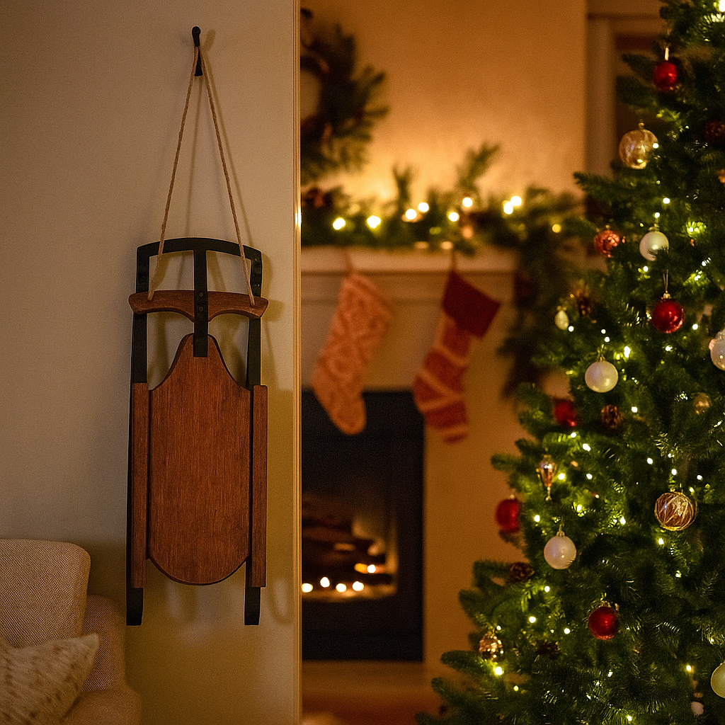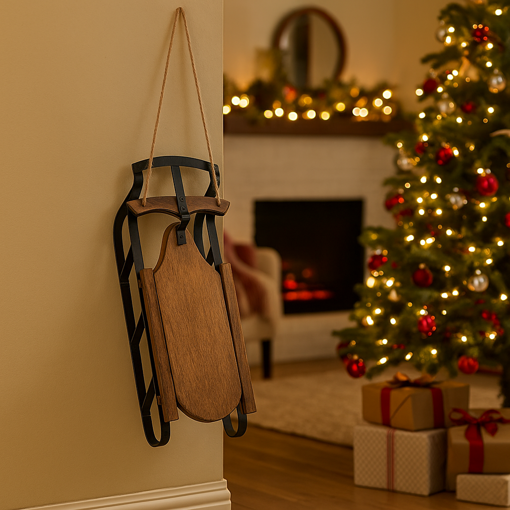 Design che riproduce una piccola slitta in stile tradizionale, ideale per richiamare l’atmosfera delle vacanze invernali e aggiungere un dettaglio scenografico alle tue decorazioni