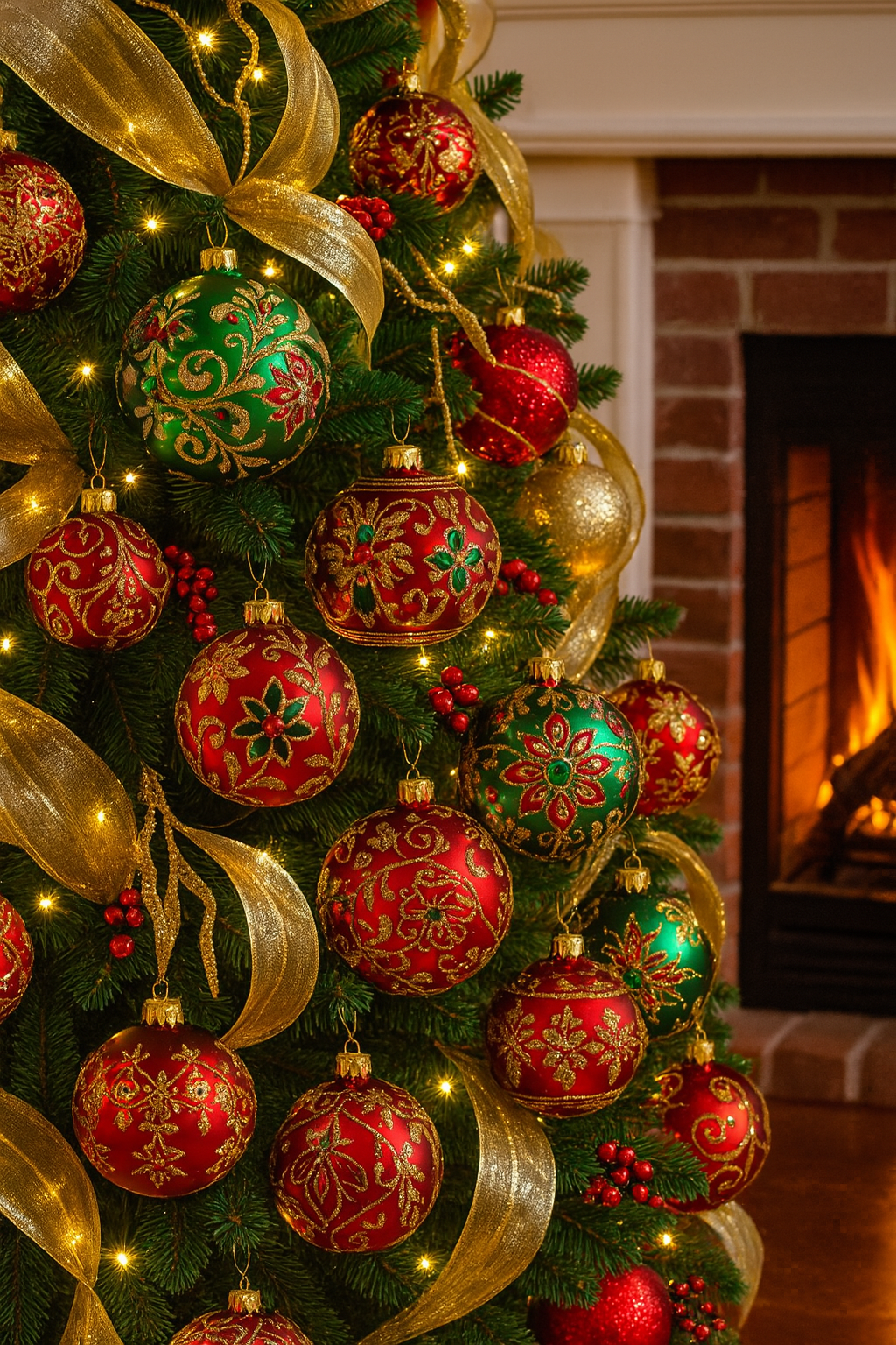 Il suo intenso sfondo rosso, arricchito da eleganti motivi floreali dorati, la rende un ornamento unico e prezioso, capace di illuminare ogni ramo con calore e stile.
