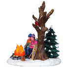 Questa scena rappresenta una dolce coppia si scalda davanti ad un falò in un bosco innevato, con fuoco illuminato!