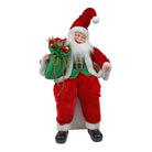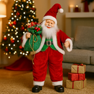 La sua figura è avvolta da un abito sontuoso nei classici toni del Natale, con una palette che alterna il rosso vivo a dettagli in verde bosco, impreziosita da profili dorati o da leggere rifiniture brillanti che catturano la luce dell’ambiente, rendendolo un punto focale ovunque venga collocato.