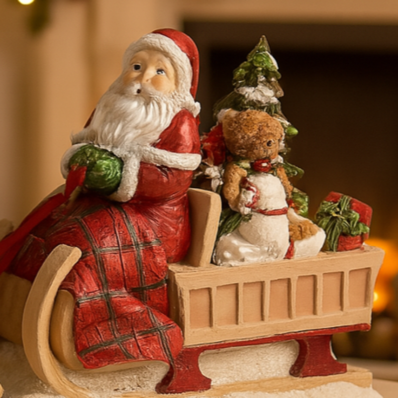 Babbo Natale dettagliato con espressione allegra, seduto sulla sua slitta riccamente decorata