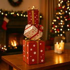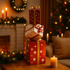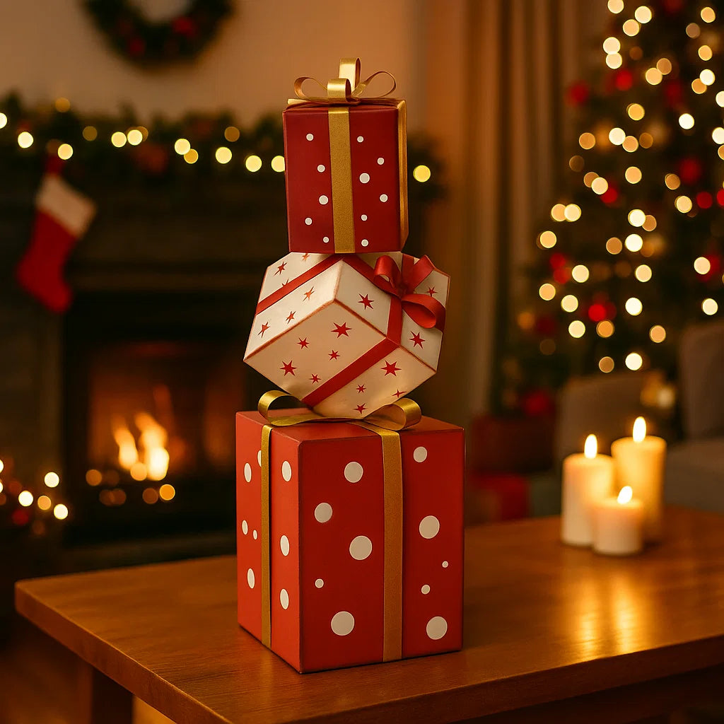 I tre regali sono spesso disposti in modo artistico, con ciascun pacco decorato con dettagli intricati, come nastri, fiocchi e motivi natalizi incisi o dipinti.
