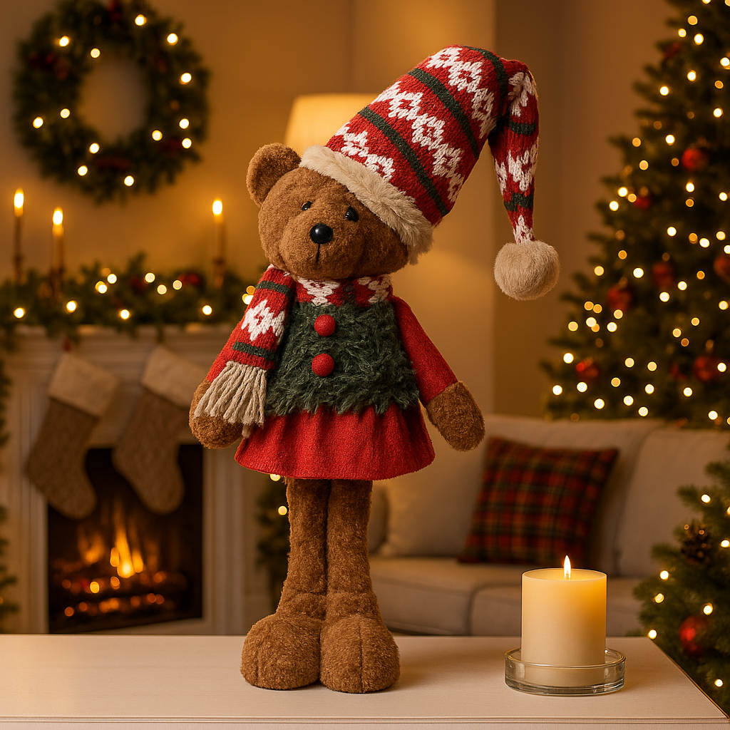 Aggiungi un tocco di dolcezza e calore alle tue decorazioni natalizie con questo orsetto in peluche soffice, perfetto per impreziosire ogni angolo della casa durante le feste.