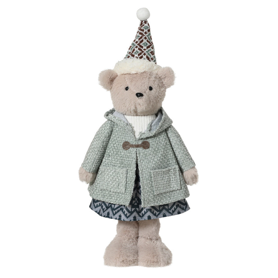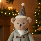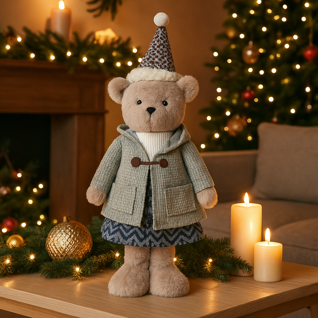 Orso decorativo in peluche con finitura soffice e dettagli natalizi