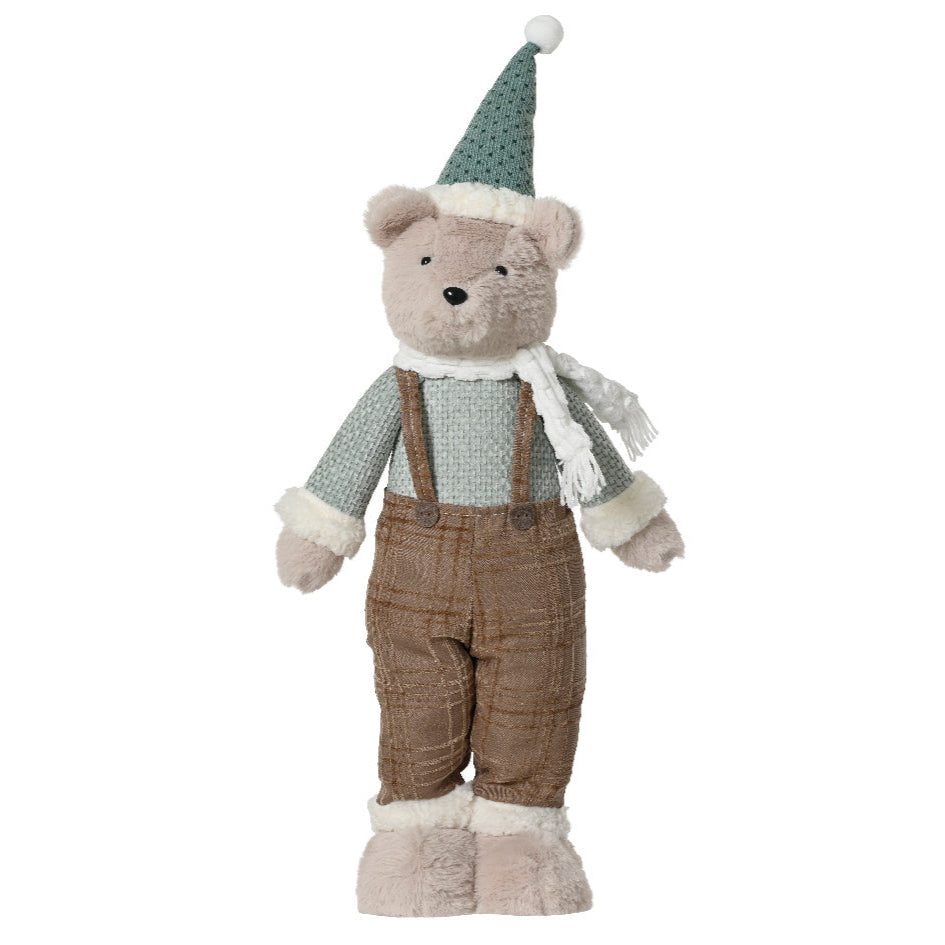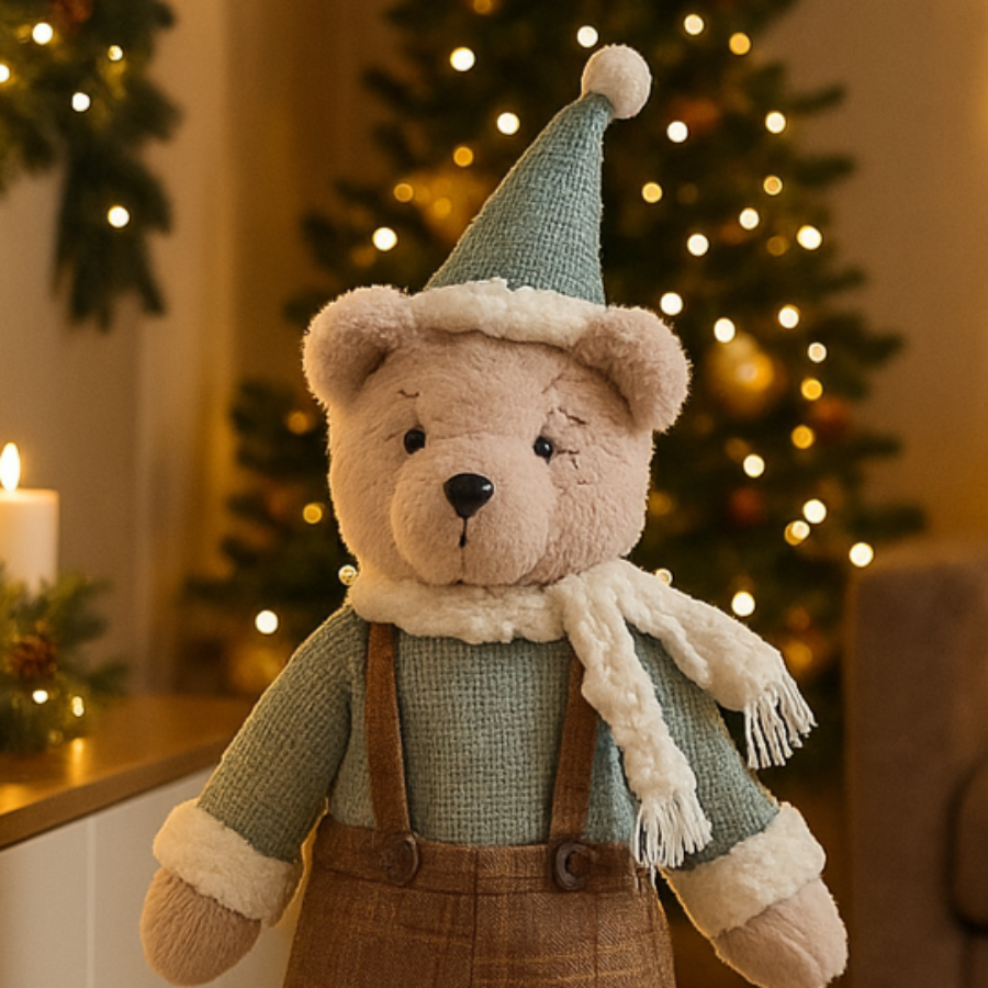Orso decorativo in peluche con finitura soffice e dettagli natalizi