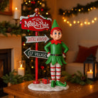 Accanto al folletto c'è un cartello stradale natalizio, che può indicare luoghi magici come "Polo Nord" o "Laboratorio di Babbo Natale".