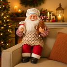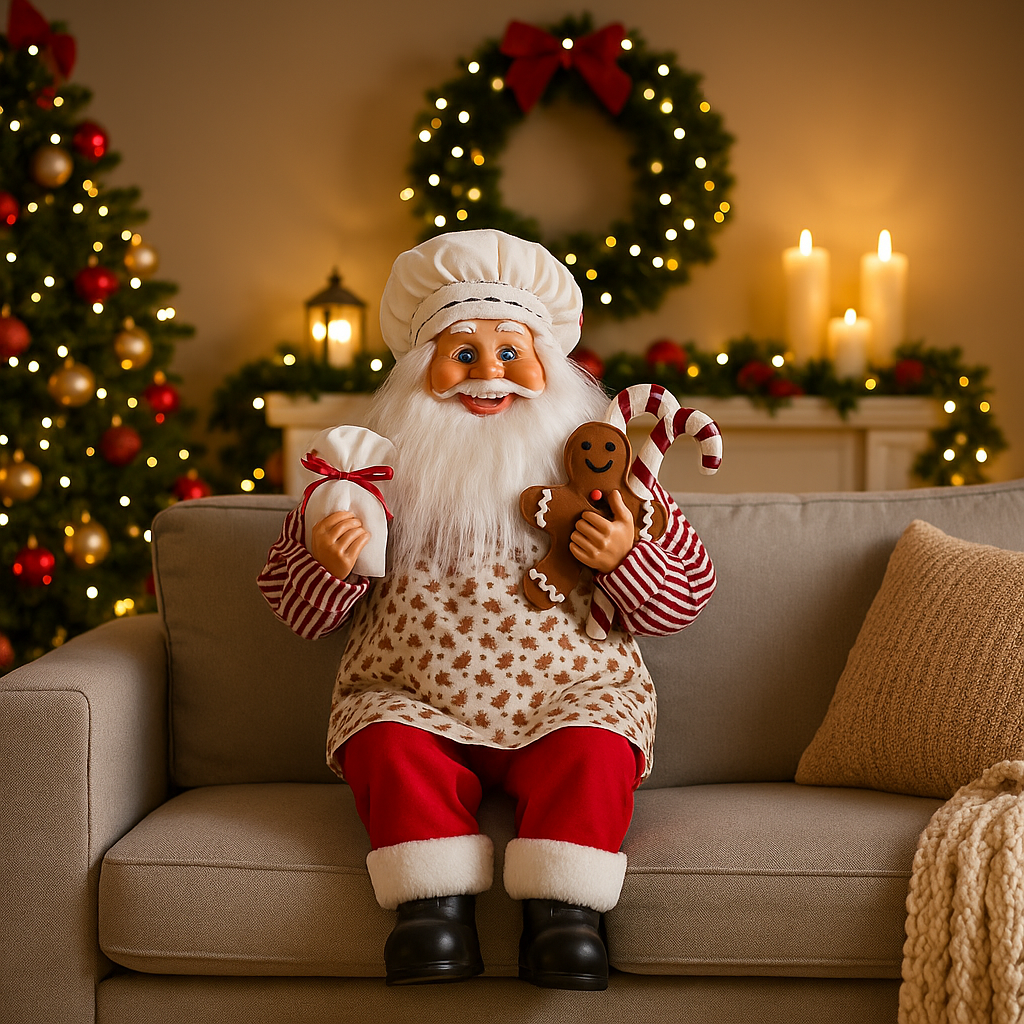 Questo Babbo Natale indossa un grembiule da chef, spesso decorato con motivi natalizi come fiocchi di neve, bastoncini di zucchero o altri simboli delle festività, sopra il suo tradizionale abito rosso.