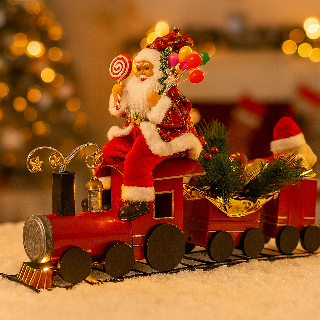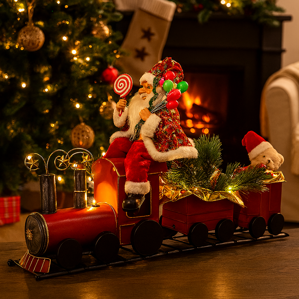 Sulla parte anteriore del treno, spicca un Babbo Natale allegro e sorridente che sembra pronto a partire per la consegna dei regali, mentre in uno dei vagoni un tenero orsetto completa la scena, aggiungendo un tocco di dolcezza che lo rende particolarmente amato anche dai bambini.