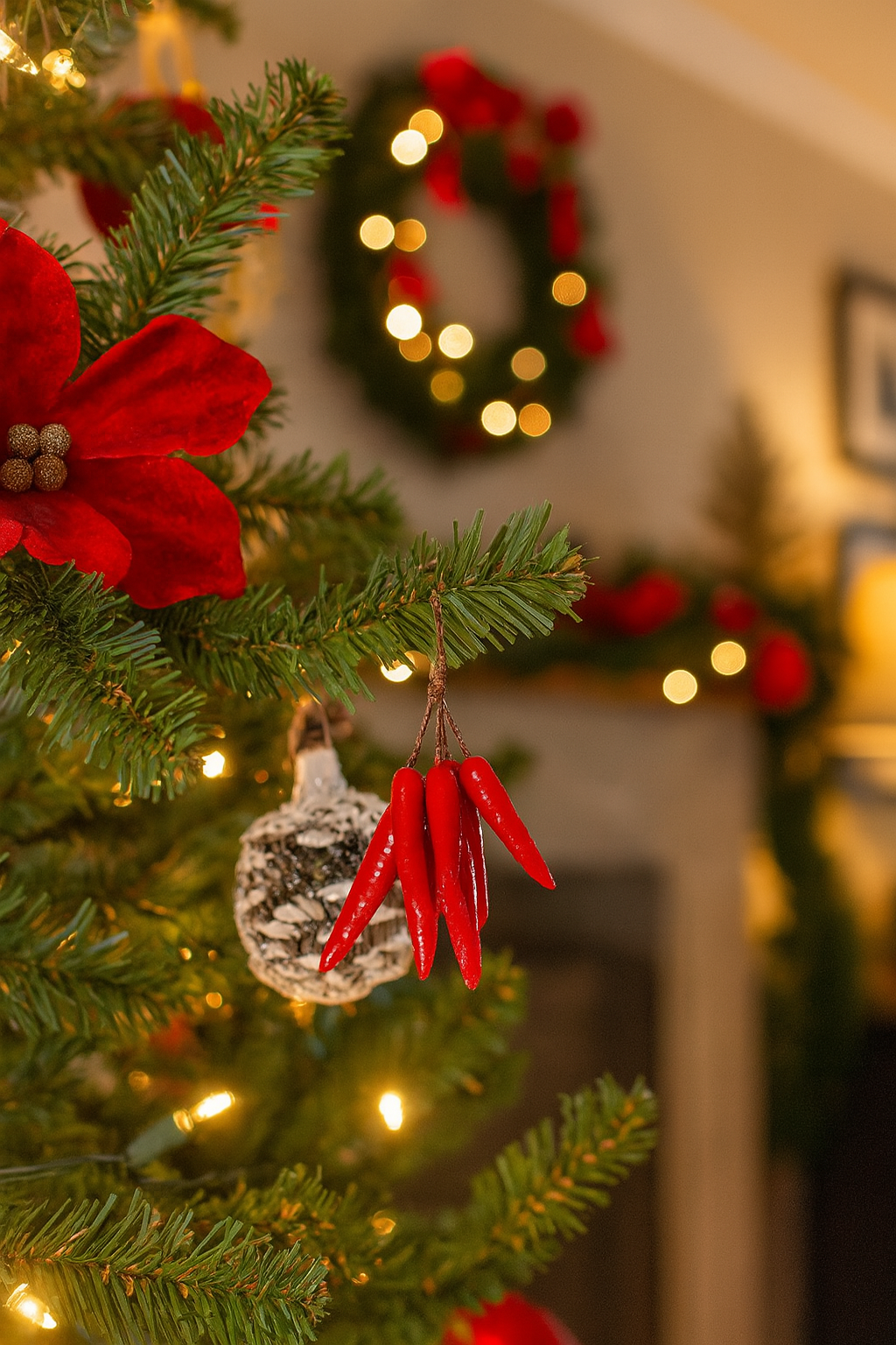Il contrasto tra il rosso intenso dei peperoncini e il verde profondo degli aghi di pino crea un effetto scenografico che richiama le tradizioni contadine del Sud Italia, dove questi frutti erano un tempo usati come portafortuna durante il solstizio invernale.