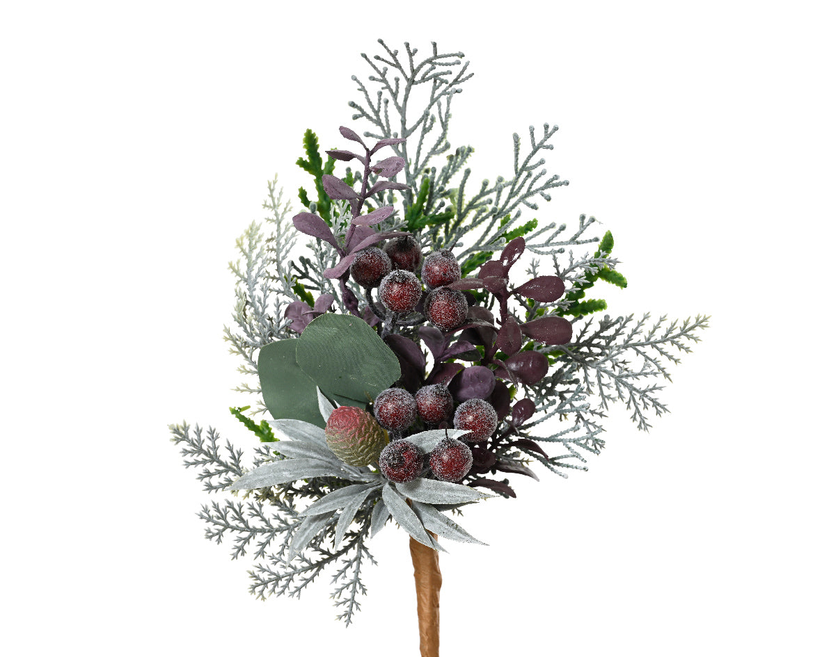 Il mix di bacche e dettagli viola aggiunge un tocco moderno alle classiche tonalità natalizie, ideale per interni, sia come singolo elemento che abbinato ad altri rami e decorazioni. Facile da inserire in composizioni floreali o da usare per impreziosire pacchi regalo.