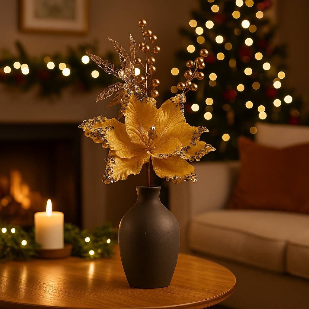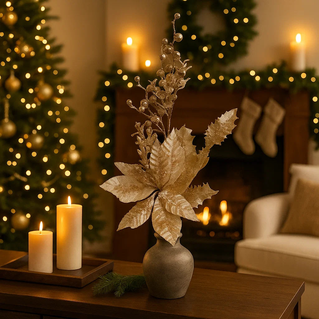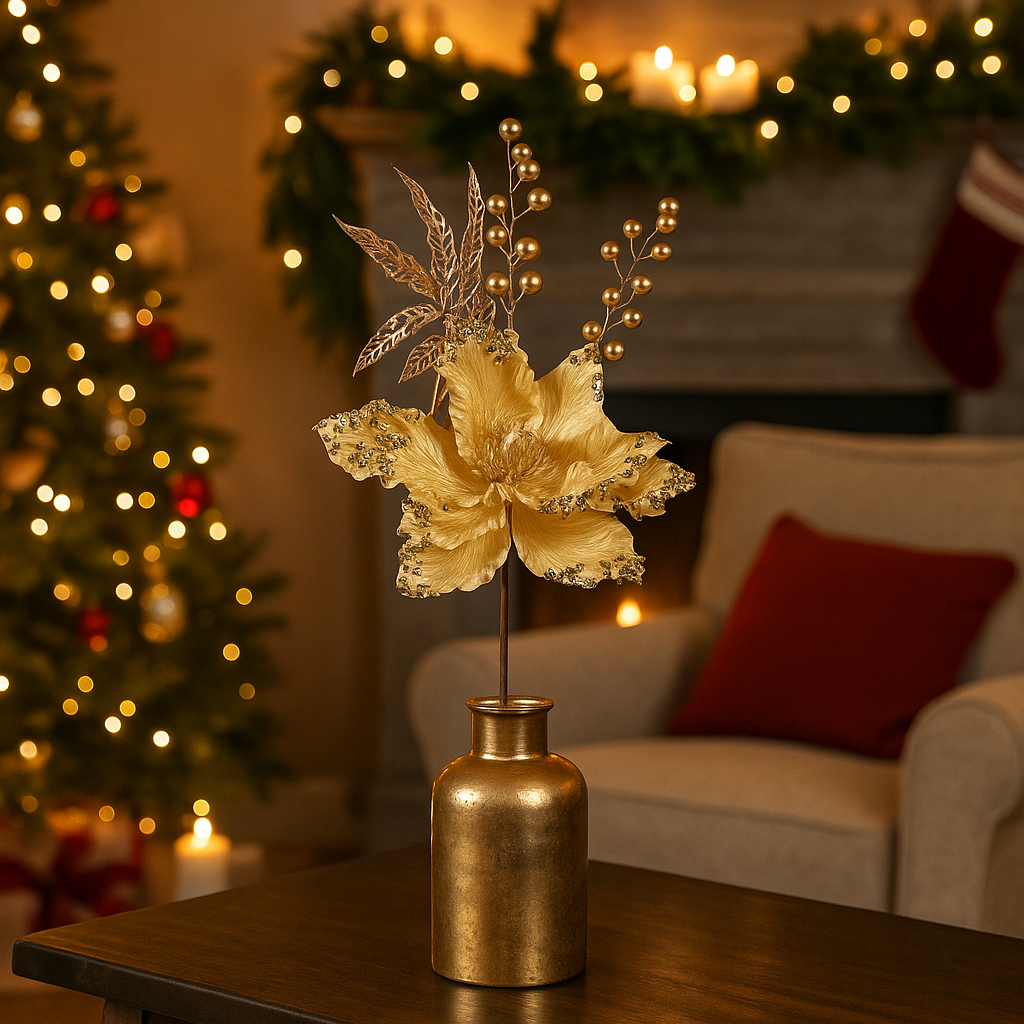 Fiore decorativo natalizio glitterato color champagne per decorazioni e composizioni h 30 cm
