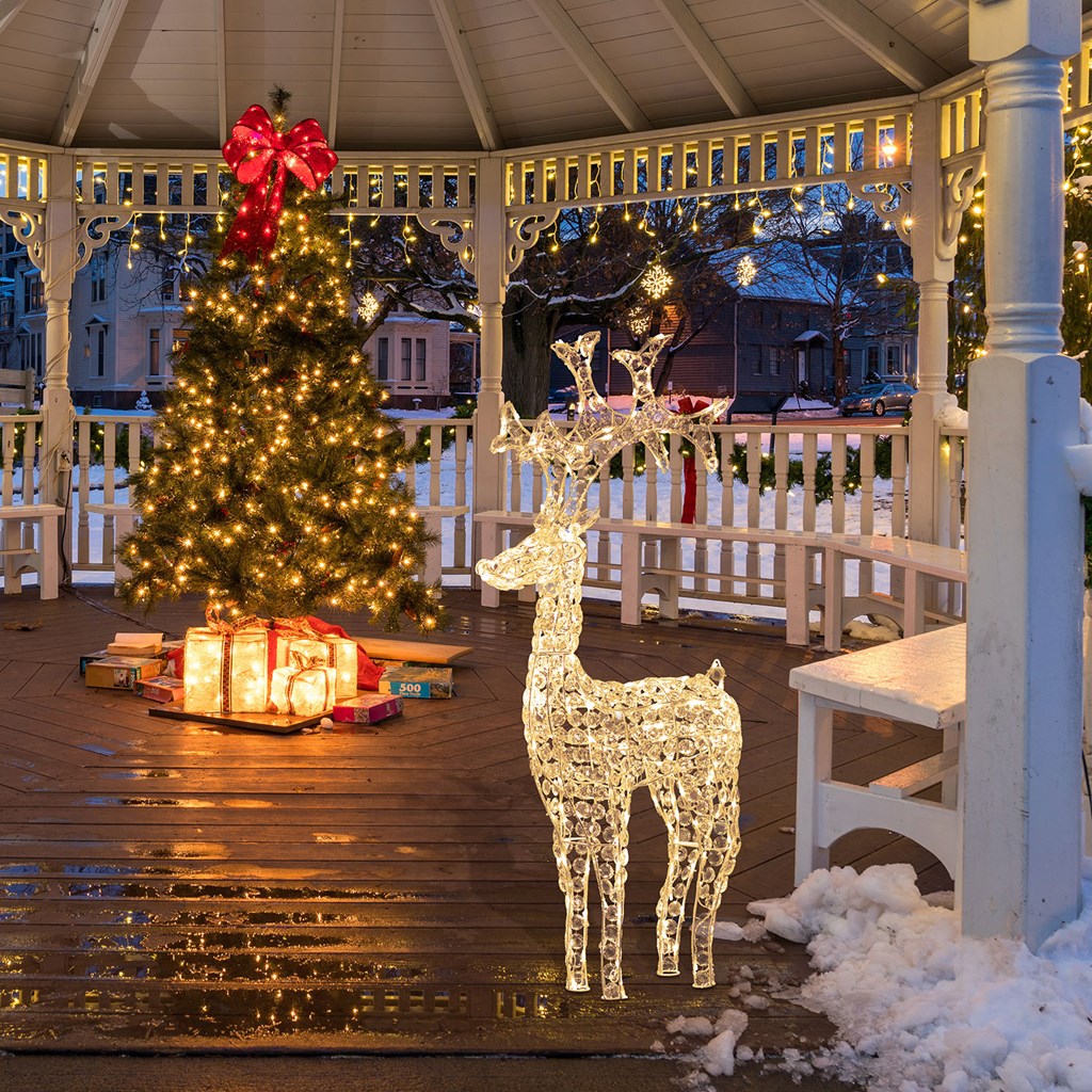 Renna con cristalli acrilici trasparenti illuminata da led a luce fissa.