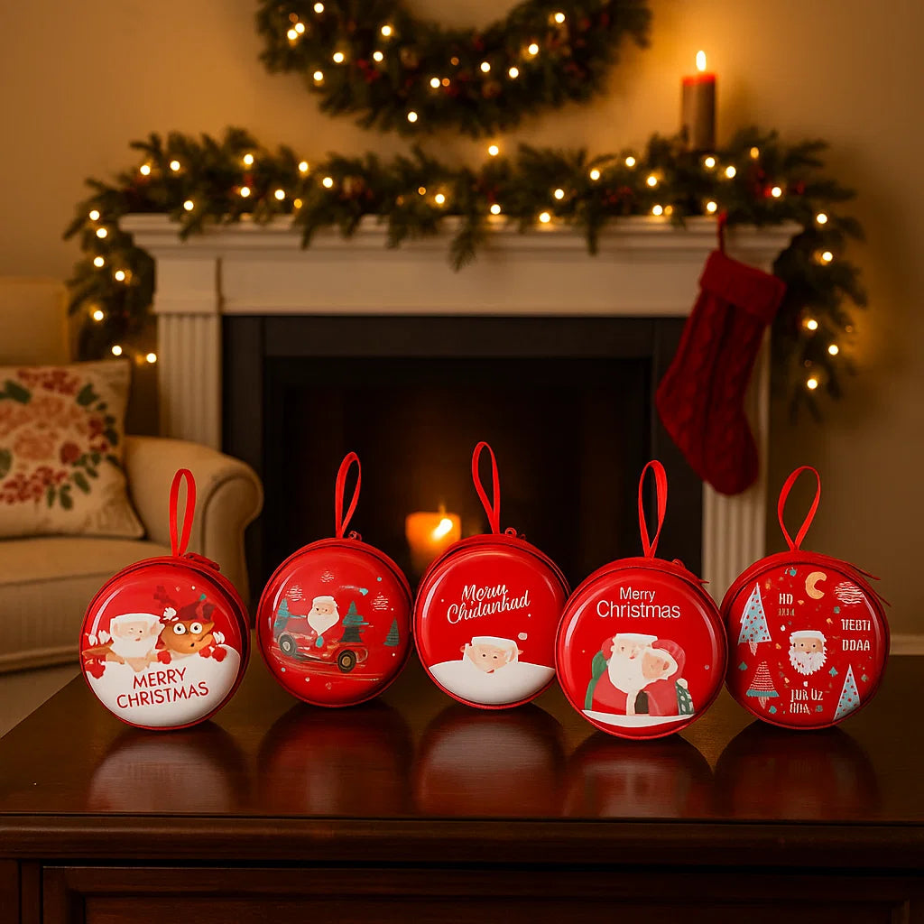 Aggiungi un tocco di fascino vintage alle tue decorazioni festive con questo delizioso cofanetto in latta con cerniera, decorato con simboli natalizi e progettato per essere appeso.