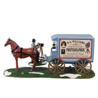 Il grande carro blu ha un grande cartello che pubblicizza i servizi fotografici di H.G. Williams. Il carro è attaccato a un cavallo ben educato ed è aperto per gli affari.