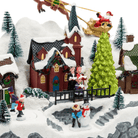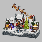 Villaggio di Natale raffigurante un paesaggio natalizio innevato, con Babbo Natale su slitta volante, pattinatori in movimento e giochi di luce colorati.