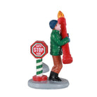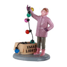 La figlia sta lavorando alle luci di Natale. Il figlio sta afferrando alcuni pezzi grandi come una grande candela e un cartello "Babbo Natale fermati qui".