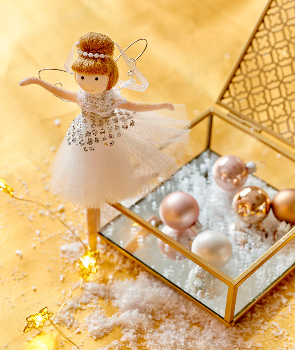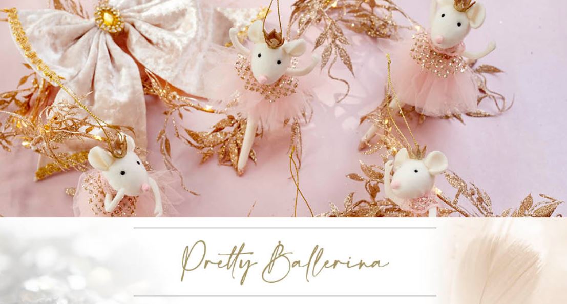 Le palline natalizie del tema Pretty Ballerina trasportano in un sogno danzante, dove la delicatezza del rosa cipria e l’eleganza del bianco si uniscono.