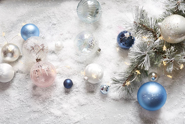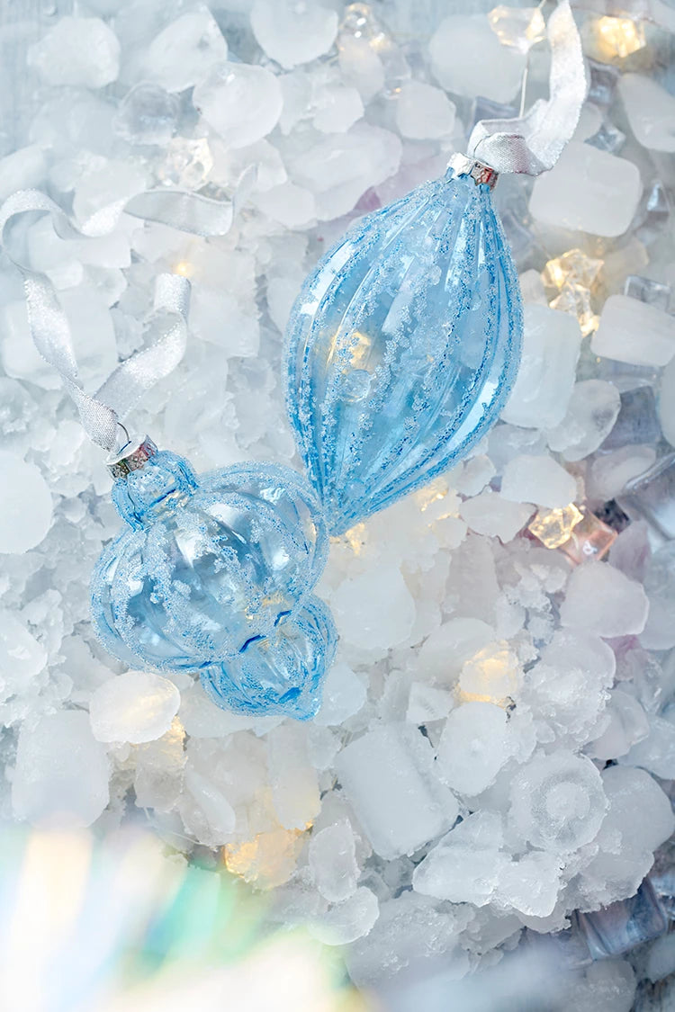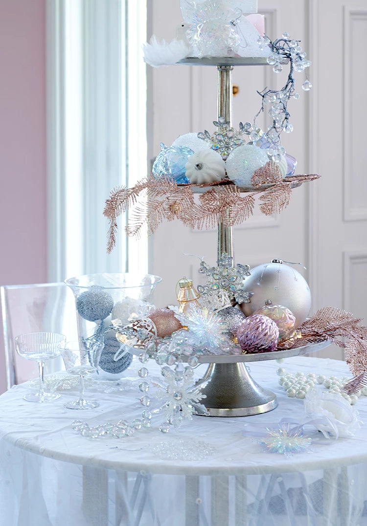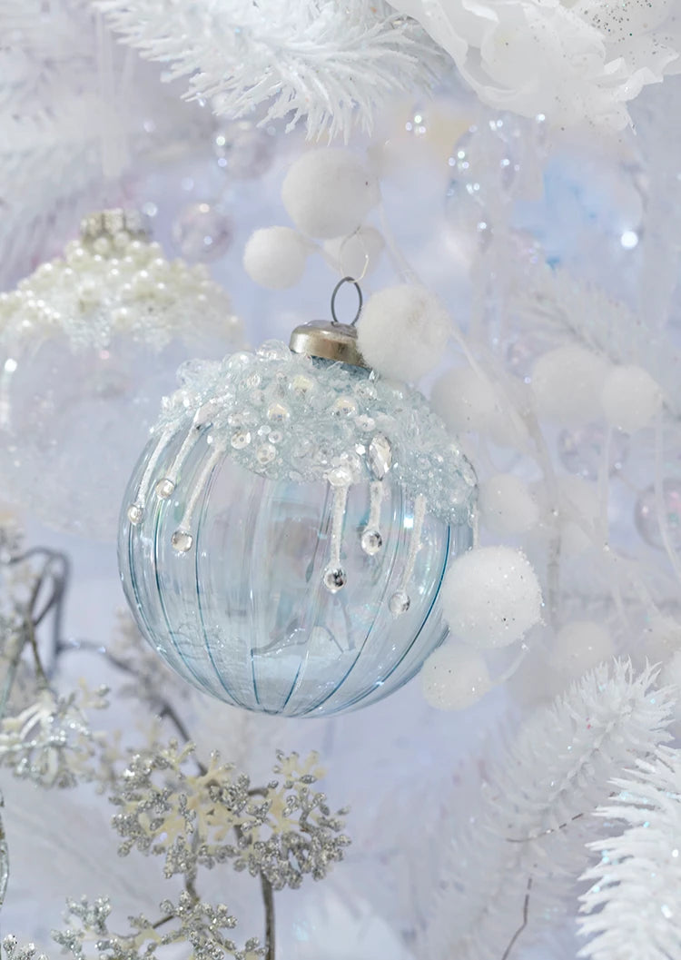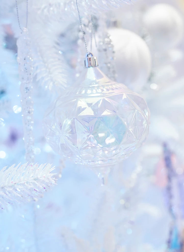 L’albero è meraviglioso e ricoperto di palline trasparenti con dettagli scintillanti e glaciali.