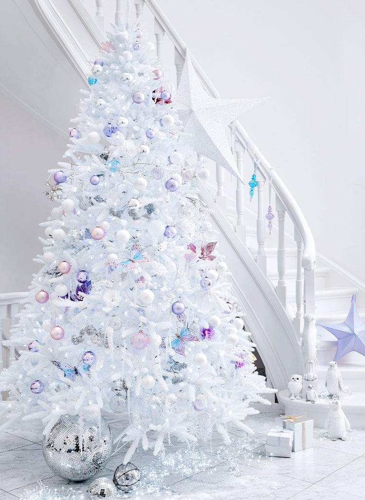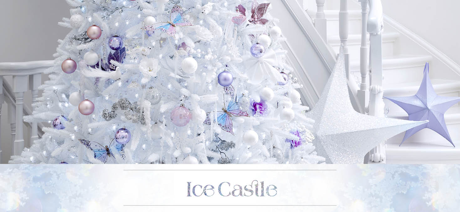 All’ingresso si trova un albero di Natale magico, con rami bianchi, iridescenti e argentati.