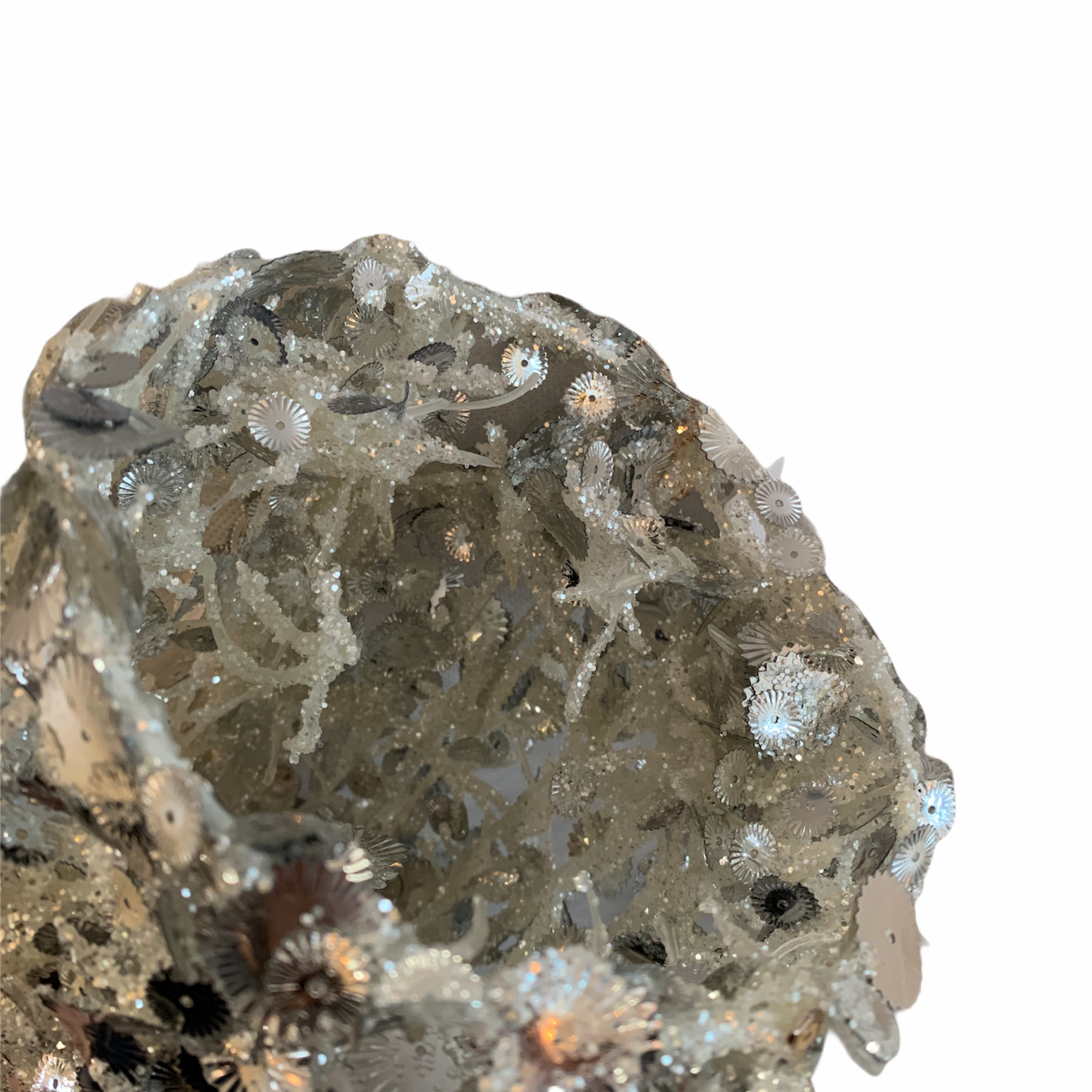 La base dorata impreziosita da un sottile strato di glitter cattura e riflette ogni bagliore, trasformando ogni ambiente in uno scrigno di luce.