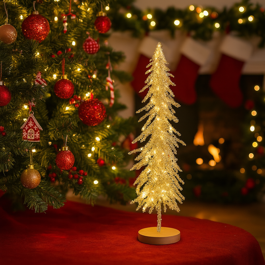 L’alberello natalizio, realizzato con una struttura portante in metallo dalle linee sottili e rivestito da foglie in plastica di un verde intenso, sprigiona un’atmosfera calda grazie alle luci integrate lungo i rami.
