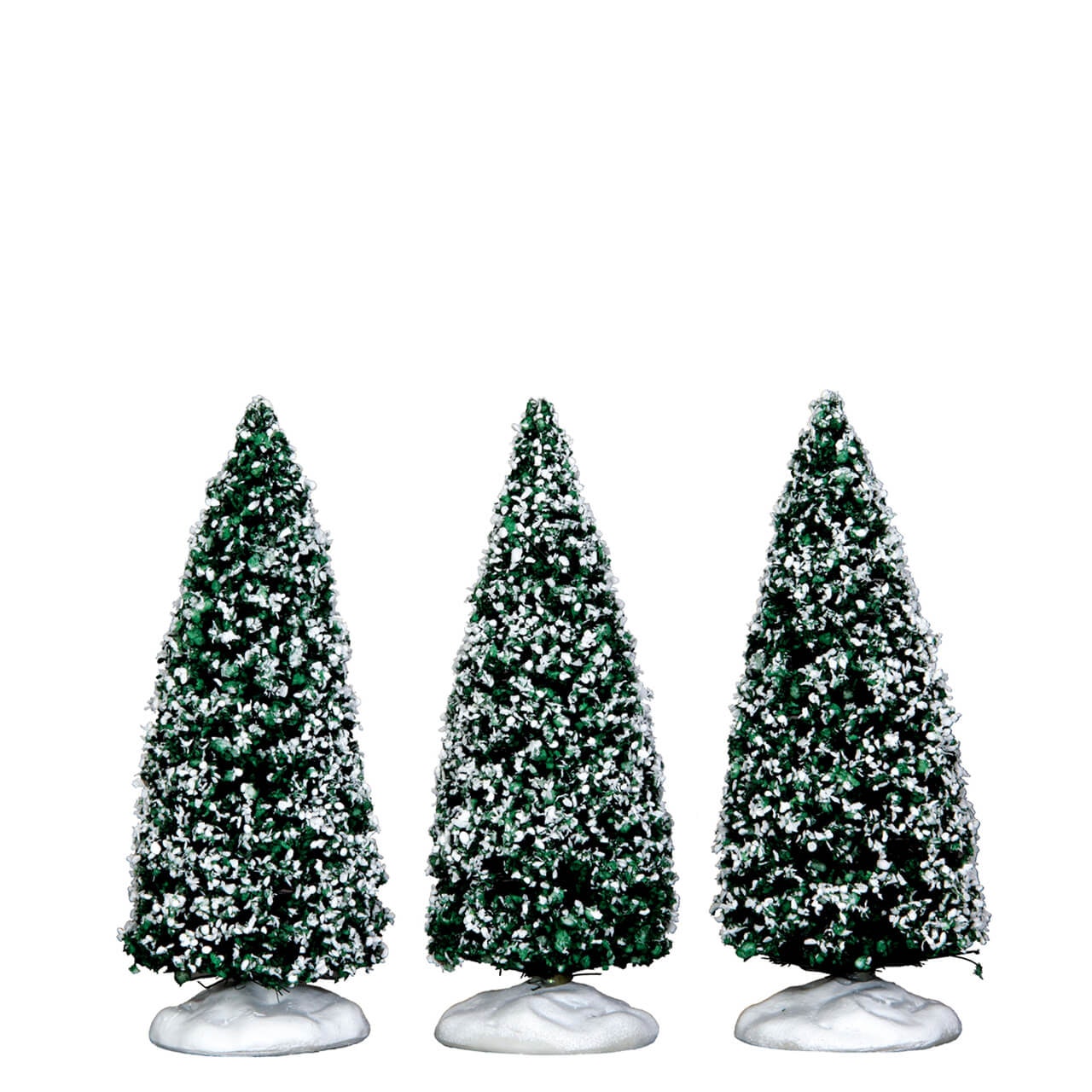 Alberi di Natale innevati Juniper, accessori per villaggio di Natale, set di 3 pezzi